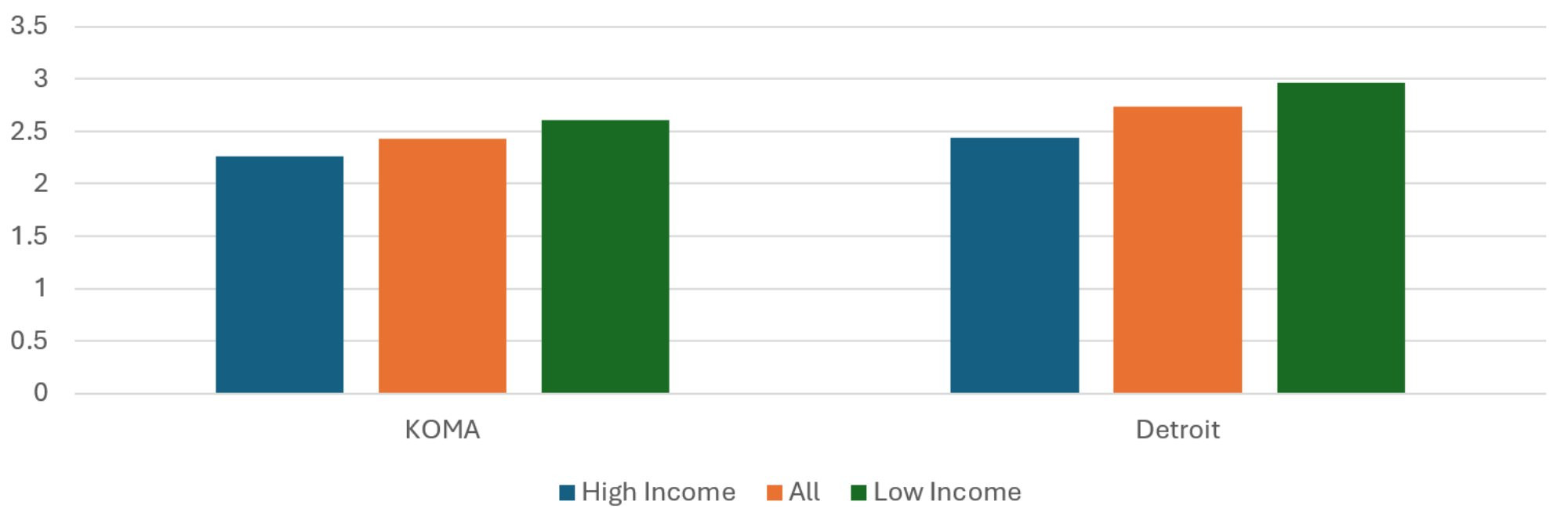 Description: The Average Risk Score, 2024 graph shows the average risk scores for the KOMA and Detroit regions when their populations are stratified by mean household income. The regional averages are presented (middle, red) as well as the average from the residents of High Income (left, blue) and Low Income (right, green) ZIP codes. The two regions exhibit similar profiles, with relatively more negative health risk factors and characteristics (high risk scores) in the Low Income ZIP codes.