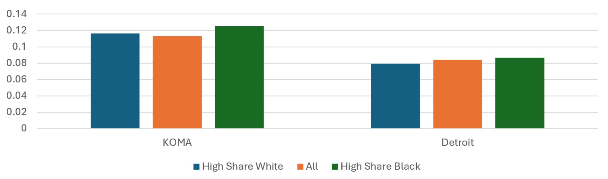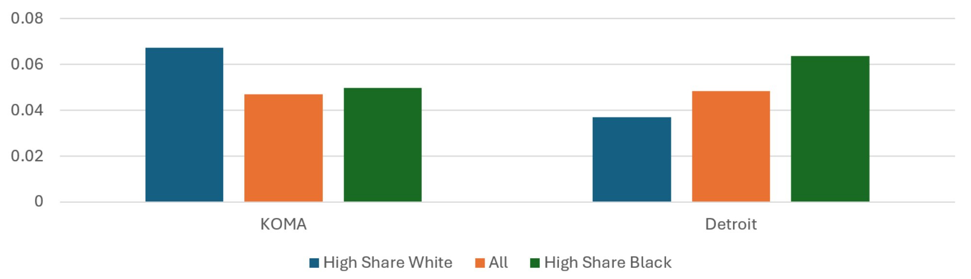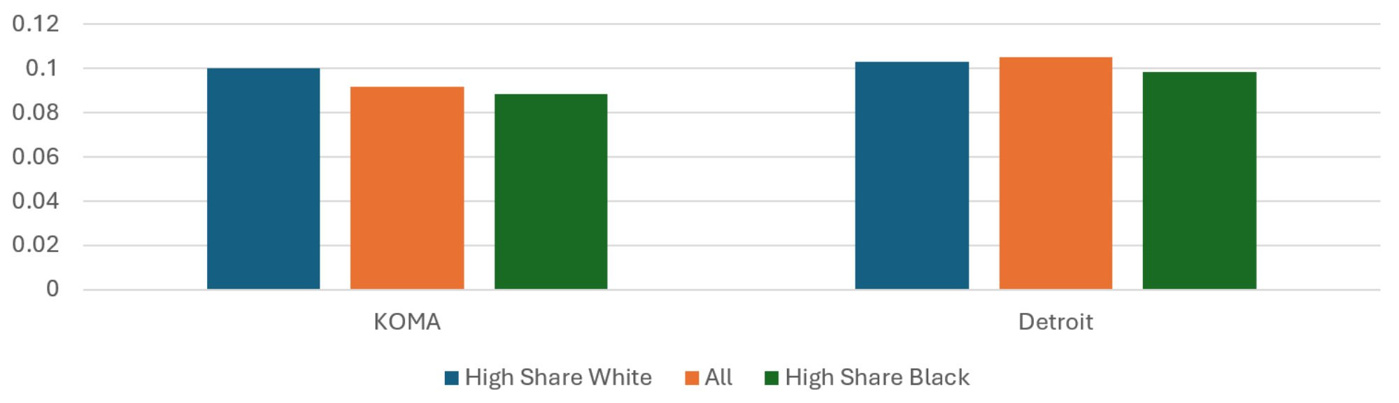 The population-weighted average risk scores across regions and quintiles are presented in Figure 10. While the average risk score is 13 percent higher in the Detroit region than in KOMA, the two do not exhibit the same relationship between risk score and racial shares of the population. In the KOMA region, the average risk score of the High Share Black ZIP codes is about the same as that of the High Share White ZIP codes for 2024. This is not true in the Detroit region, where the High Share Black ZIP codes have an average risk score 17 percent higher than the High Share White ZIP codes, which is roughly the same as in previous years. The Detroit pattern of racial disparity in risk score is not far off of the income disparity in risk score, so it is not clear whether race or income is most responsible for the risk score differences. For KOMA, on the other hand, the disparity observed when stratifying by income is not observed when stratifying by race.