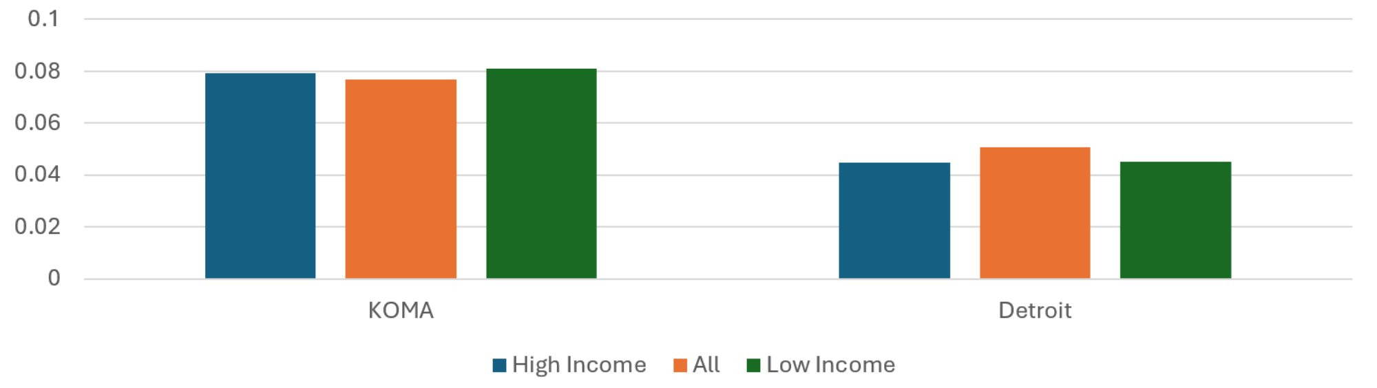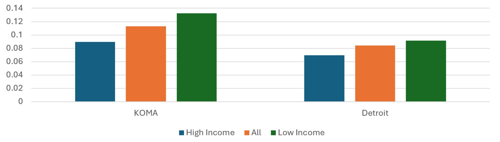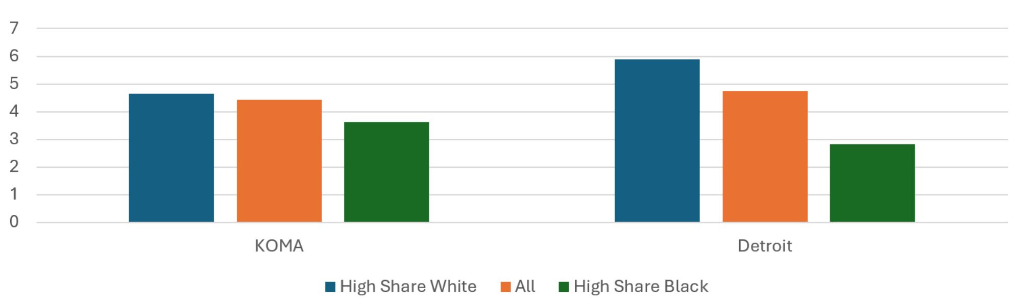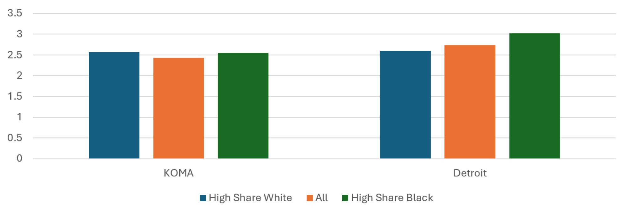 The population-weighted average risk scores across regions and quintiles are presented in Figure 10. While the average risk score is 13 percent higher in the Detroit region than in KOMA, the two do not exhibit the same relationship between risk score and racial shares of the population. In the KOMA region, the average risk score of the High Share Black ZIP codes is about the same as that of the High Share White ZIP codes for 2024. This is not true in the Detroit region, where the High Share Black ZIP codes have an average risk score 17 percent higher than the High Share White ZIP codes, which is roughly the same as in previous years. The Detroit pattern of racial disparity in risk score is not far off of the income disparity in risk score, so it is not clear whether race or income is most responsible for the risk score differences. For KOMA, on the other hand, the disparity observed when stratifying by income is not observed when stratifying by race.