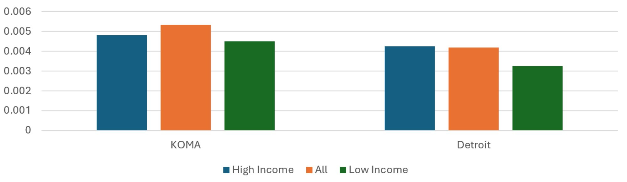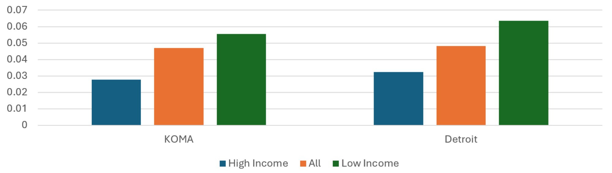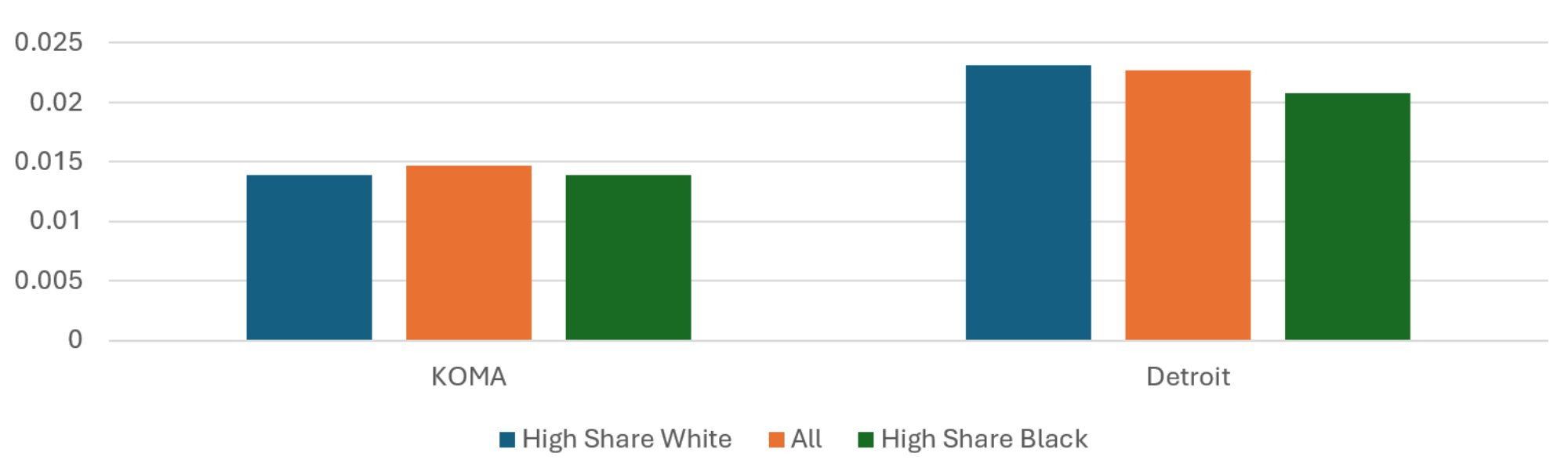 In Table 1, we see that KOMA has a slightly lower mean household income than Detroit, but it also has a tighter income distribution. We also see the weighted Black and white shares of the populations of these sets of ZIP codes. As has already been noted in the literature, this presents difficulties in disentangling the impacts of socioeconomic status and race (Jamil et al. 2008, Meliker et al. 2009). This introduces an important caveat in the regional comparison that will be reflected again when we stratify by race: while the top income quintiles for KOMA and Detroit are not strikingly different from each other, the bottom income quintiles look very different in terms of racial distribution. So, while we will be comparing across regions those ZIP codes comprising the 20 percent of the populations with the highest weighted Black share of the population in later tables, we cannot say those quintiles have similar racial distributions.