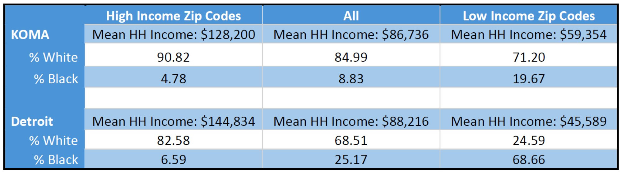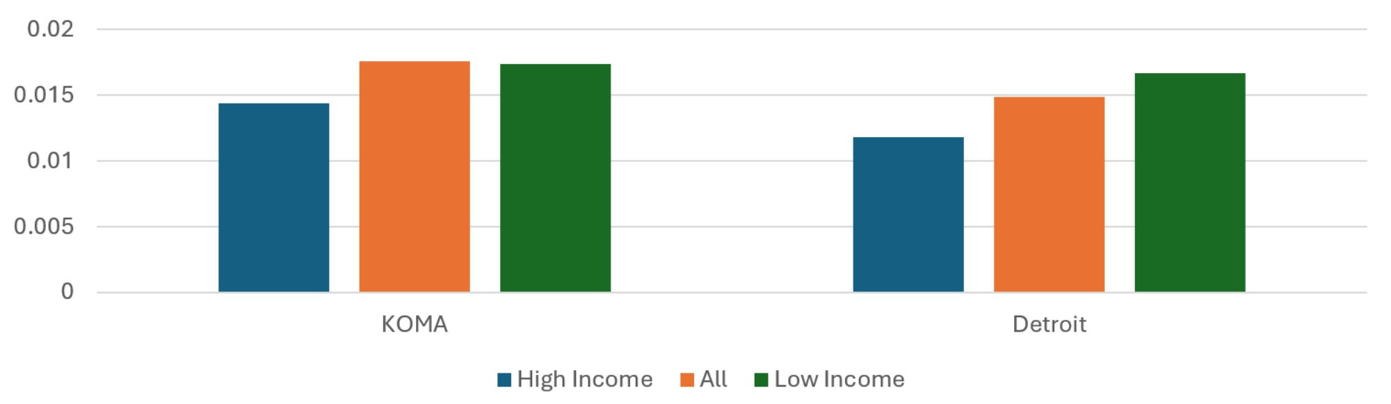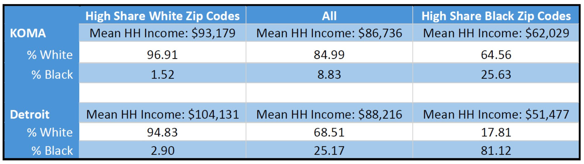 In Table 1, we see that KOMA has a slightly lower mean household income than Detroit, but it also has a tighter income distribution. We also see the weighted Black and white shares of the populations of these sets of ZIP codes. As has already been noted in the literature, this presents difficulties in disentangling the impacts of socioeconomic status and race (Jamil et al. 2008, Meliker et al. 2009). This introduces an important caveat in the regional comparison that will be reflected again when we stratify by race: while the top income quintiles for KOMA and Detroit are not strikingly different from each other, the bottom income quintiles look very different in terms of racial distribution. So, while we will be comparing across regions those ZIP codes comprising the 20 percent of the populations with the highest weighted Black share of the population in later tables, we cannot say those quintiles have similar racial distributions.