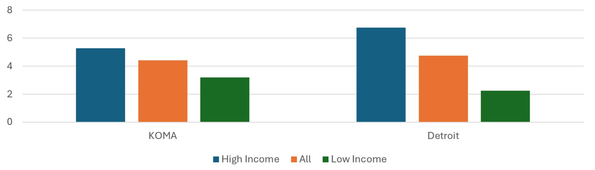 Figure 3 presents the ratios of healthy months to total member months. While previous reports showed a slight positive relationship between income quintile and healthy month ratio in KOMA, the updated methods now reveal a pronounced negative relationship. Also new is the percentage gap in healthy month ratio is greater in KOMA than it is in Detroit. The percentage gap in healthy month ratio between highest and lowest income quintiles in KOMA is 34 percent greater than that for Detroit in 2024. This is a big difference from 2023, when Detroit’s was 10 percent less than KOMA’s. Furthermore, as the income gap between High and Low Income ZIP codes is lower in KOMA than in Detroit, this shows substantially greater income disparities in healthy months in KOMA than in Detroit. While it seems counterintuitive that healthy months would be relatively common among the residents of the Low Income ZIP codes, the age conditions on the definition of healthy months is likely to inflate the measure among ZIP codes with relatively young resident populations.