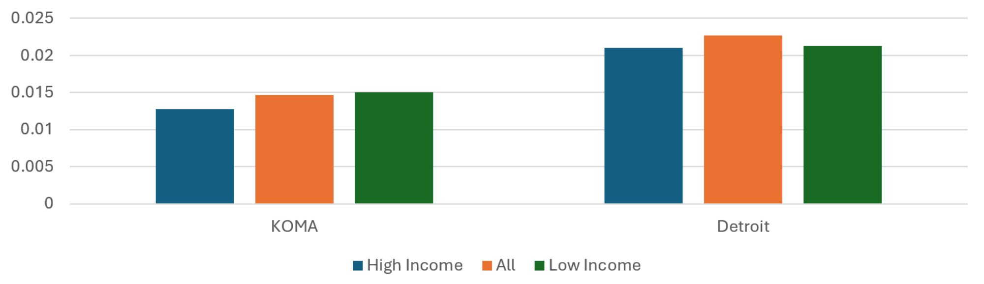 On the whole, when examining disparities due to income, we find patterns that are similar in the two regions. Relative to High Income ZIP codes, Low Income ZIP codes in the two regions tend to have higher average risk scores and fewer privately insured months per resident. Additionally, Low Income ZIP codes exhibit a relatively low share of months with an asthma diagnosis. The opposite was true for months with a diabetes diagnosis, which was more common among Low Income ZIP codes in the two regions. The exceptions to these common patterns were for CAD and hyperlipidemia, where there were small income disparities for KOMA but not for Detroit. This is not a radical departure from previous reports, but the presence of income disparities specific to the KOMA region remains a concern.