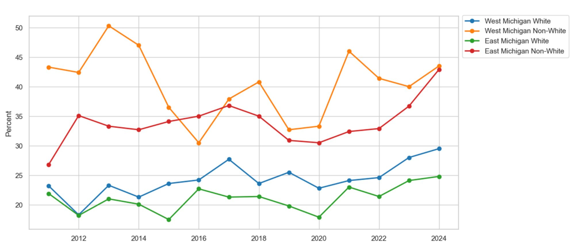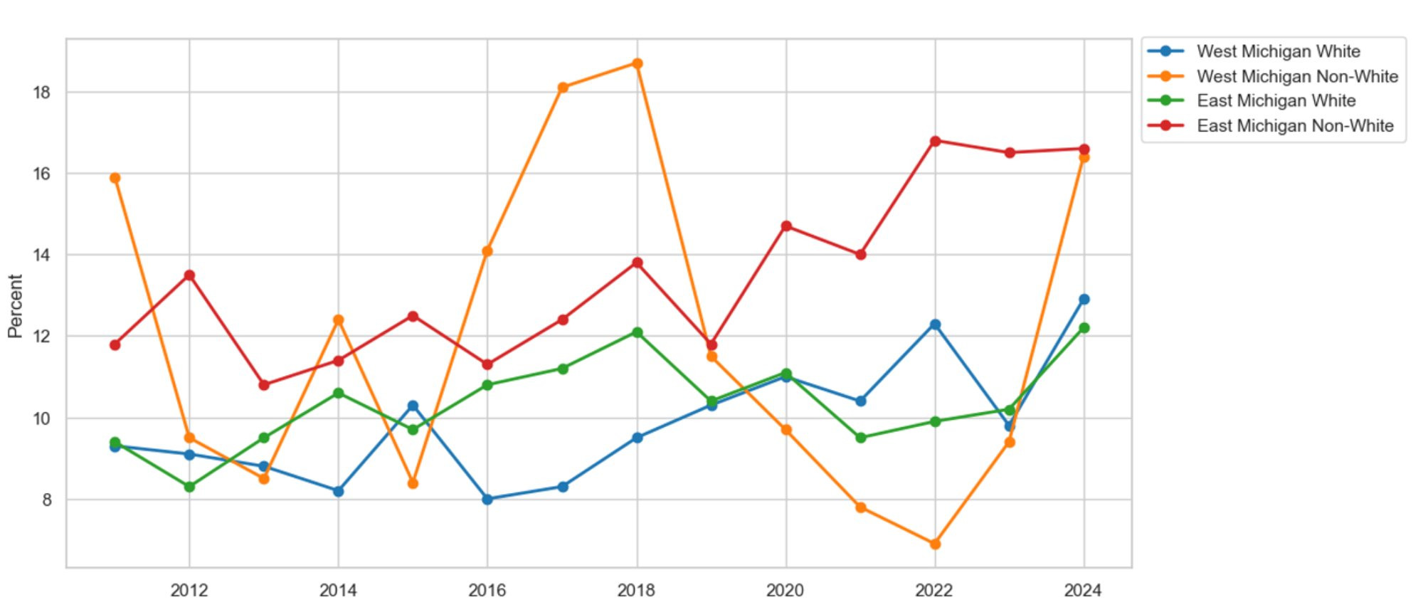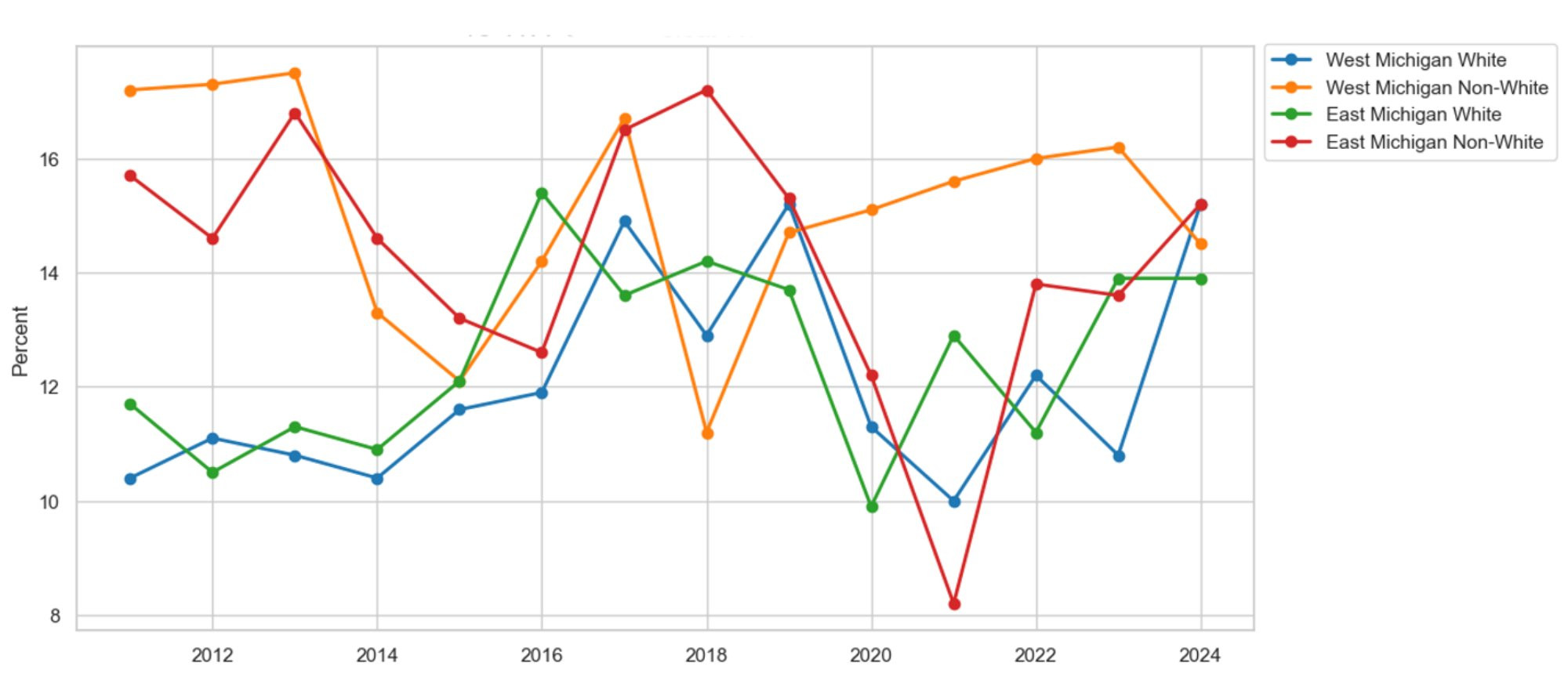 Figure 22 highlights the prevalence of depression by race and region. A data transformation warrants comment. For our non-white series, we add the proportion of residents reporting 14 or more poor mental health days, noting that minorities are less likely to seek professional help and are therefore less likely to receive a depression diagnosis (Panchal et al., 2024). We find that depression is up among all races and regions, except for those non-white residents in West Michigan. For example, since 2011, 6.3 percent more West Michigan whites report a depression diagnosis; however, this increase in depression pales in comparison to the rise in depression among East Michigan non-whites. Since 2011, depression within East Michigan’s non-white community has increased by 16.1 percent. Furthermore, the graphs also highlight the racial disparity in depression. On average, 16.1 percent more non-white residents report depression compared to white residents in West Michigan. Similarly, 12.9 percent more non-whites report depression than whites in East Michigan.