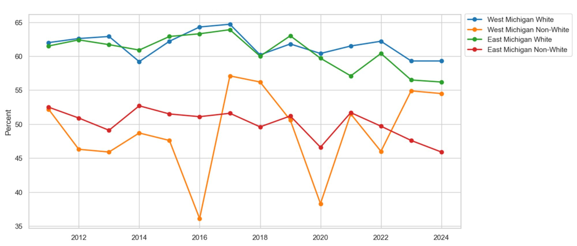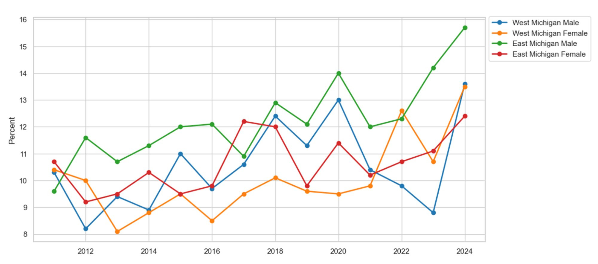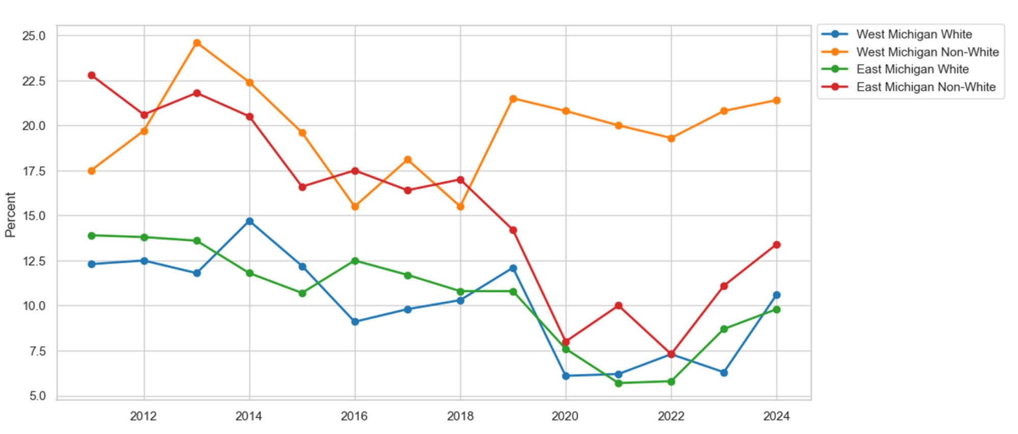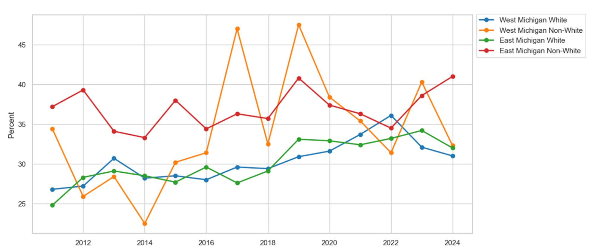 Figure 22 highlights the prevalence of depression by race and region. A data transformation warrants comment. For our non-white series, we add the proportion of residents reporting 14 or more poor mental health days, noting that minorities are less likely to seek professional help and are therefore less likely to receive a depression diagnosis (Panchal et al., 2024). We find that depression is up among all races and regions, except for those non-white residents in West Michigan. For example, since 2011, 6.3 percent more West Michigan whites report a depression diagnosis; however, this increase in depression pales in comparison to the rise in depression among East Michigan non-whites. Since 2011, depression within East Michigan’s non-white community has increased by 16.1 percent. Furthermore, the graphs also highlight the racial disparity in depression. On average, 16.1 percent more non-white residents report depression compared to white residents in West Michigan. Similarly, 12.9 percent more non-whites report depression than whites in East Michigan.