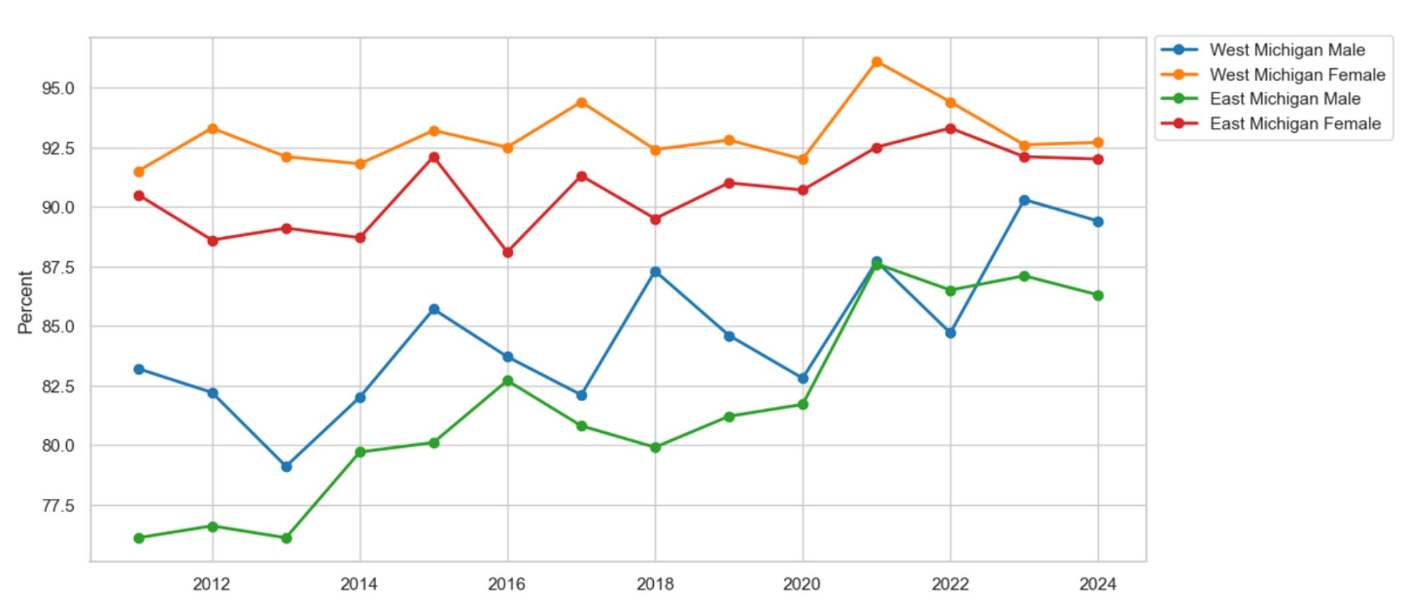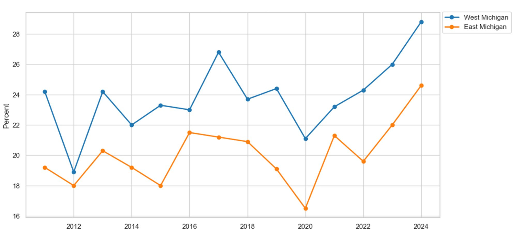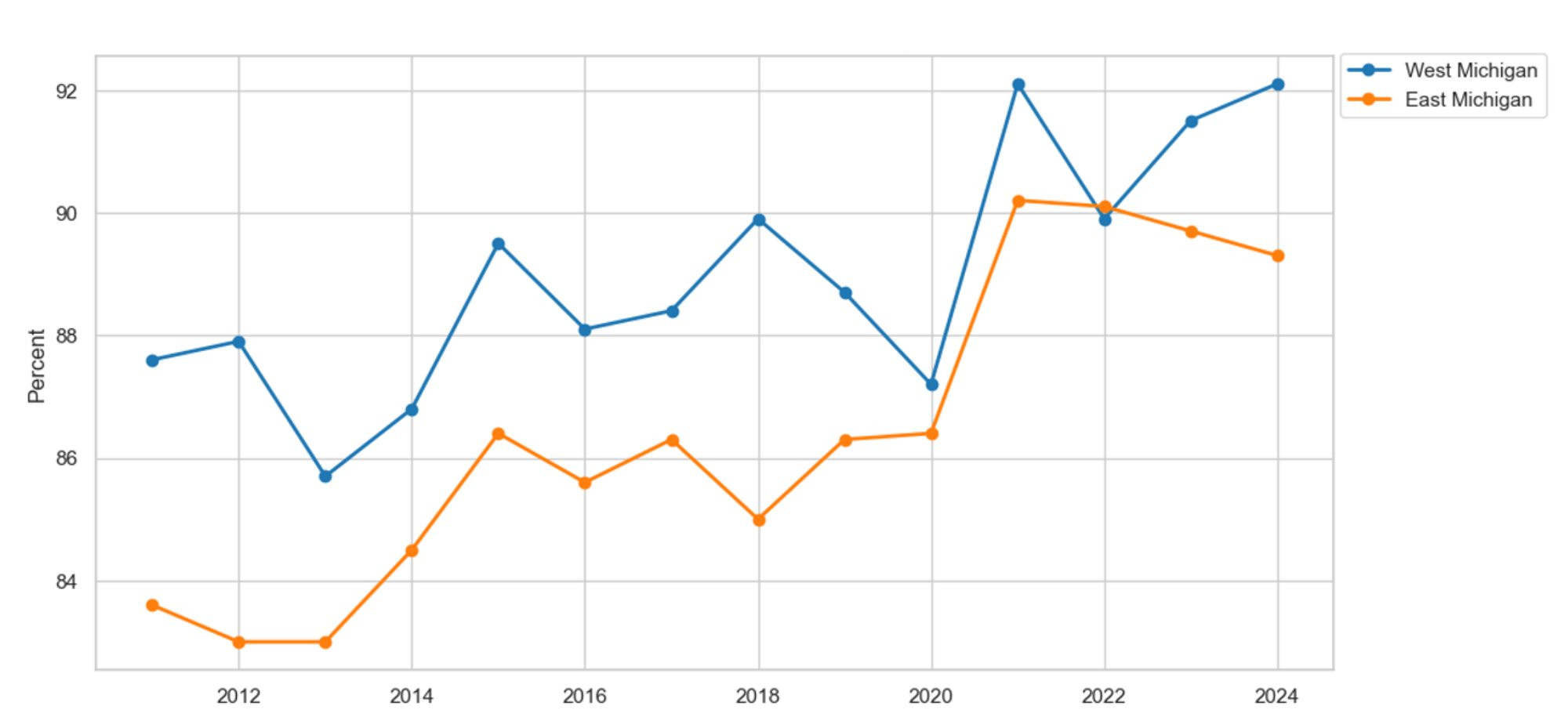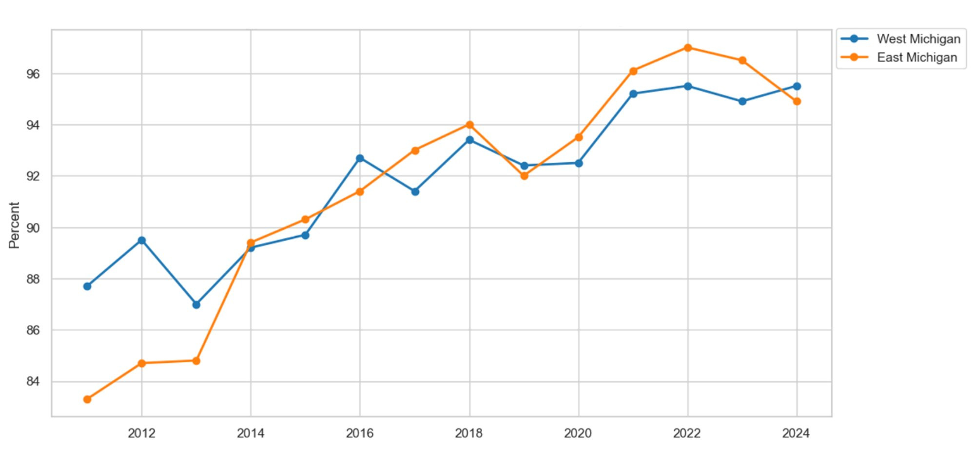 Description: Figure 30 shows the percentage of survey respondents in East and West Michigan who report having health insurance. On average, the proportion of the population covered by health insurance has increased in both regions since 2011. However, since 2022, health insurance coverage has been declining in both areas.