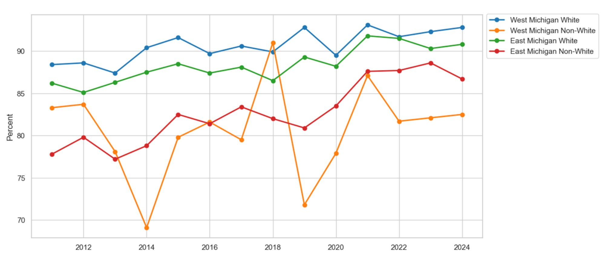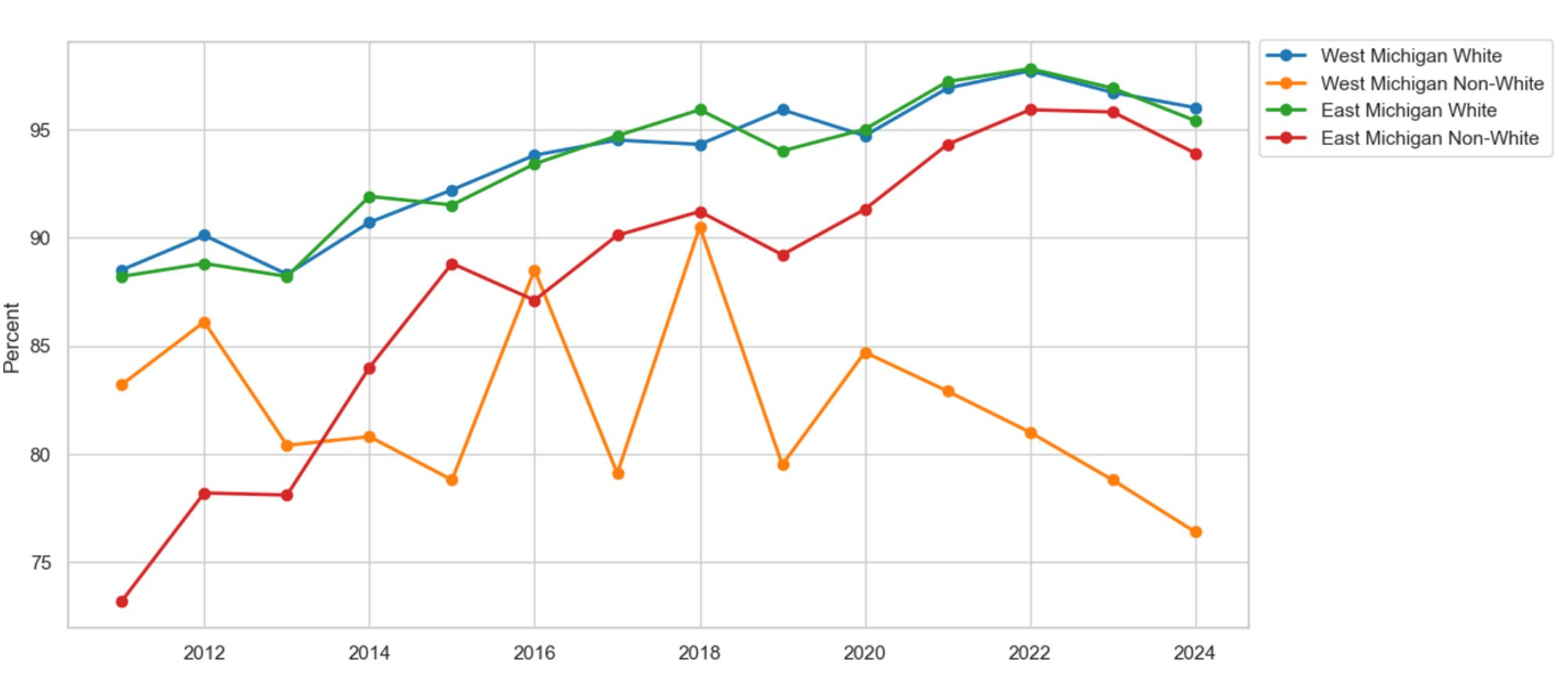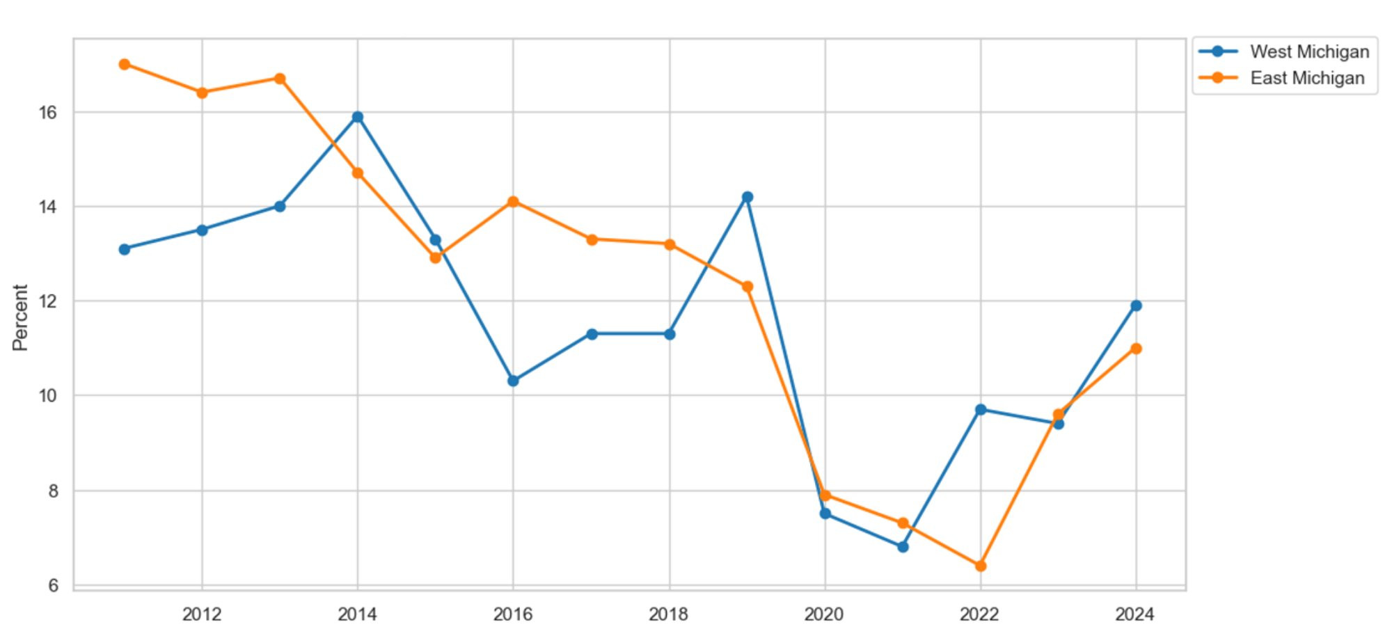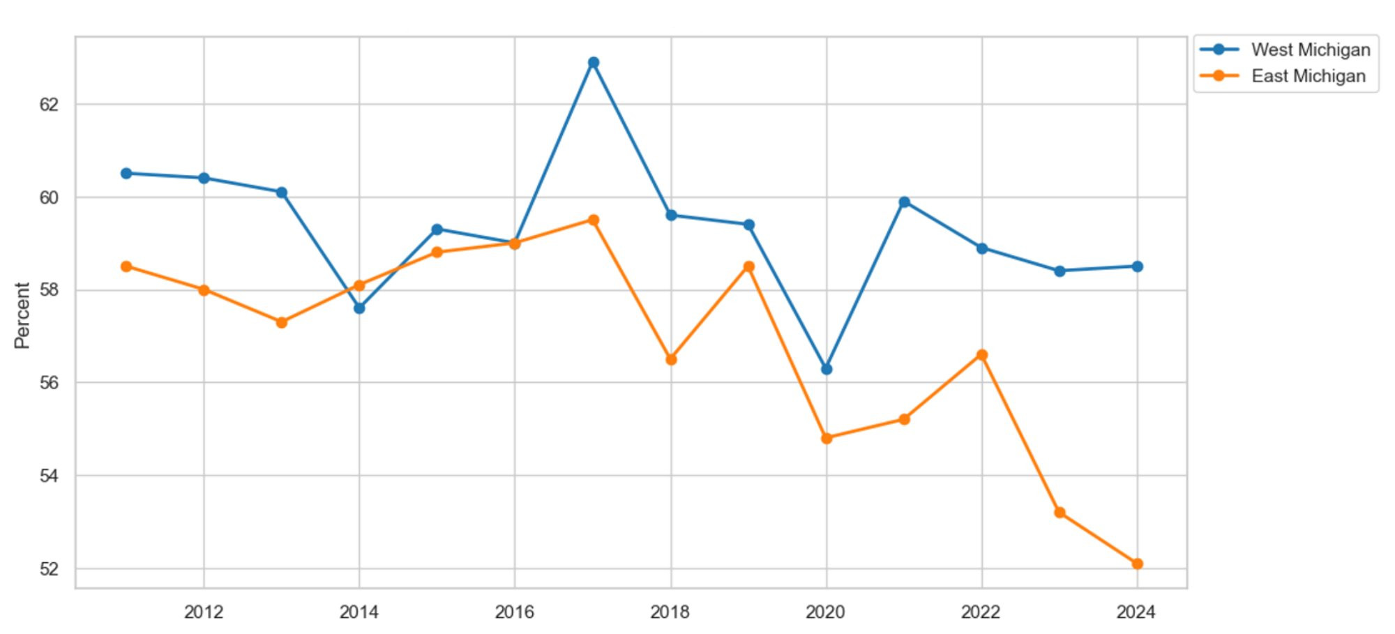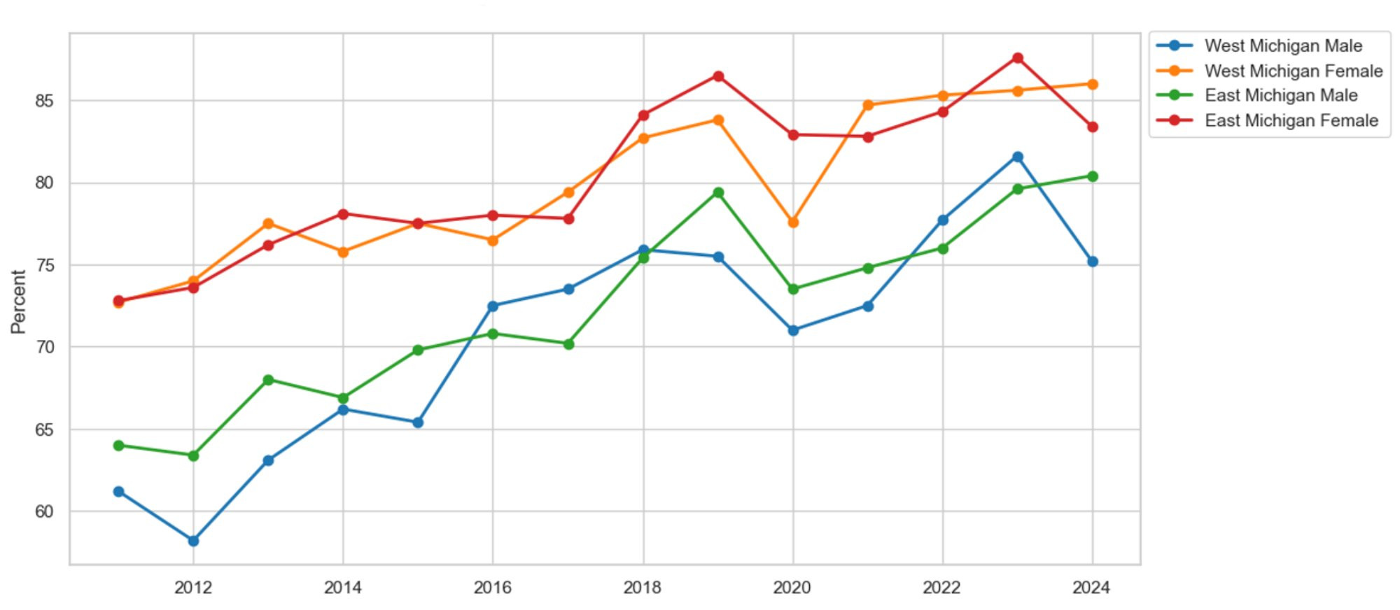 Description: Figure 30 shows the percentage of survey respondents in East and West Michigan who report having health insurance. On average, the proportion of the population covered by health insurance has increased in both regions since 2011. However, since 2022, health insurance coverage has been declining in both areas.