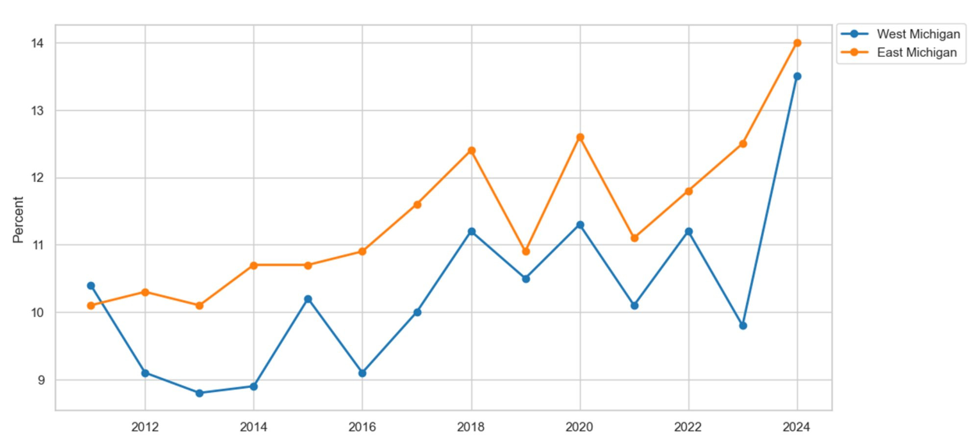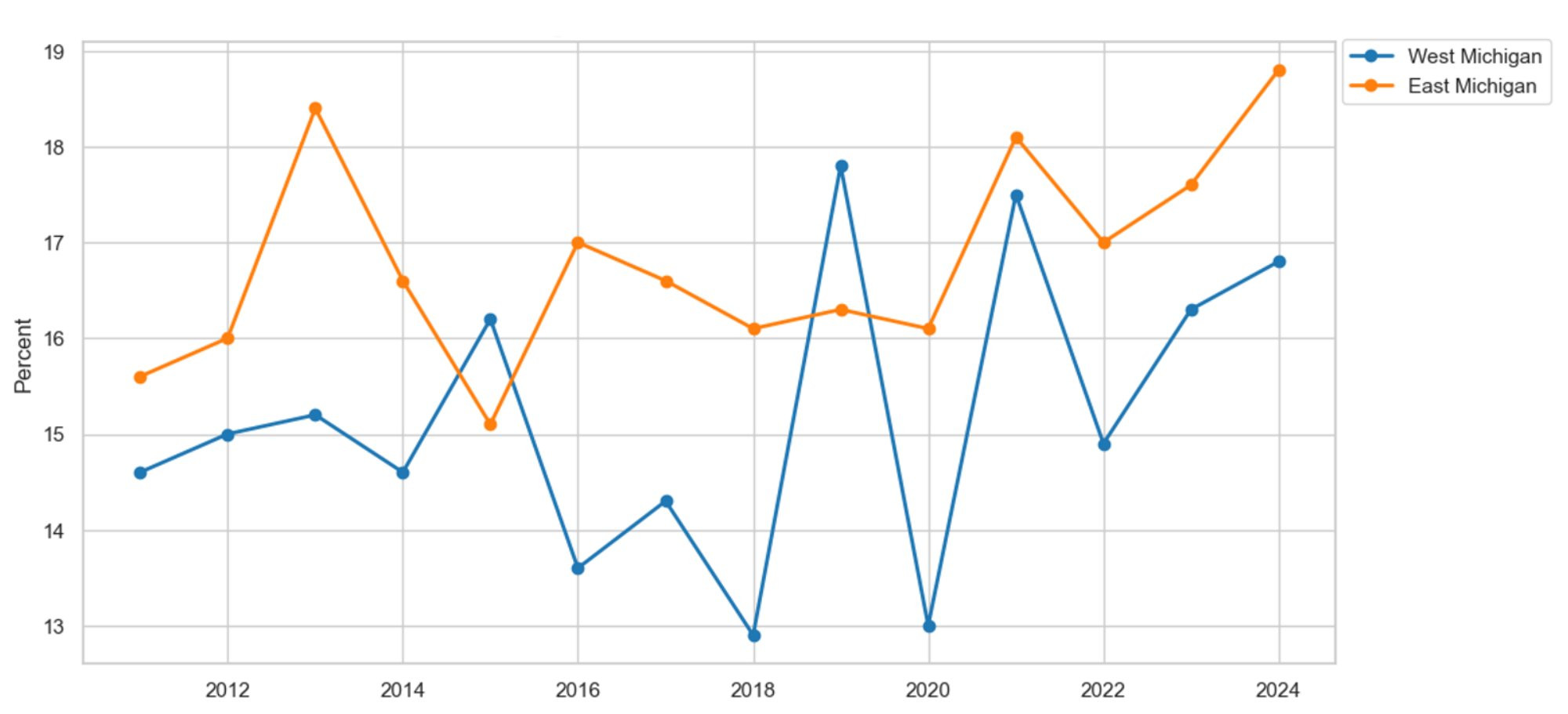 Description: Figure 1 illustrates the percentage of survey respondents reporting lifetime asthma in East and West Michigan. Overall, the percentage of residents reporting asthma is higher in East Michigan compared to West Michigan. Before the COVID-19 pandemic in 2019, asthma levels remained relatively stable in both regions. However, since the start of the pandemic, asthma has been steadily increasing in both areas.