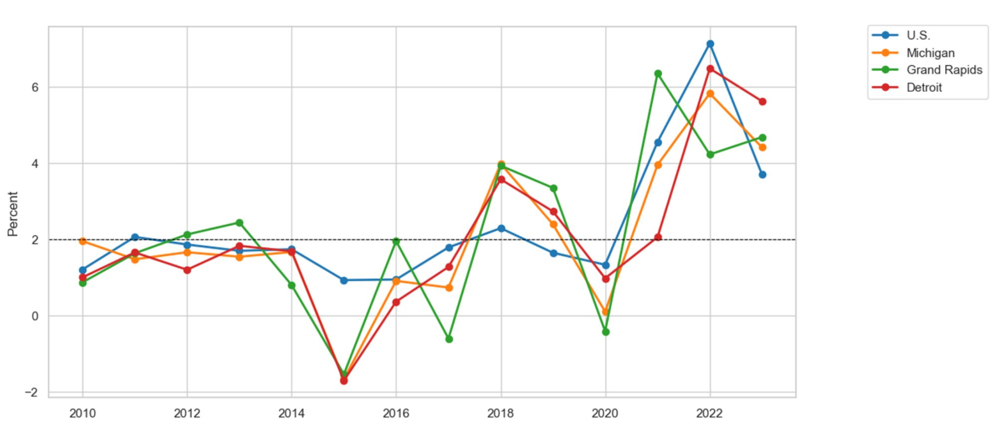 Description: Figure 29 shows the inflation rate based on the implicit price deflator in the U.S., Michigan, Grand Rapids, and Detroit. On average, the inflation rate before the COVID-19 pandemic in 2020 was below the Federal Reserve's target for a healthy economy. Since the start of the COVID-19 pandemic, however, the inflation rate has been twice the Federal Reserve’s historical target.