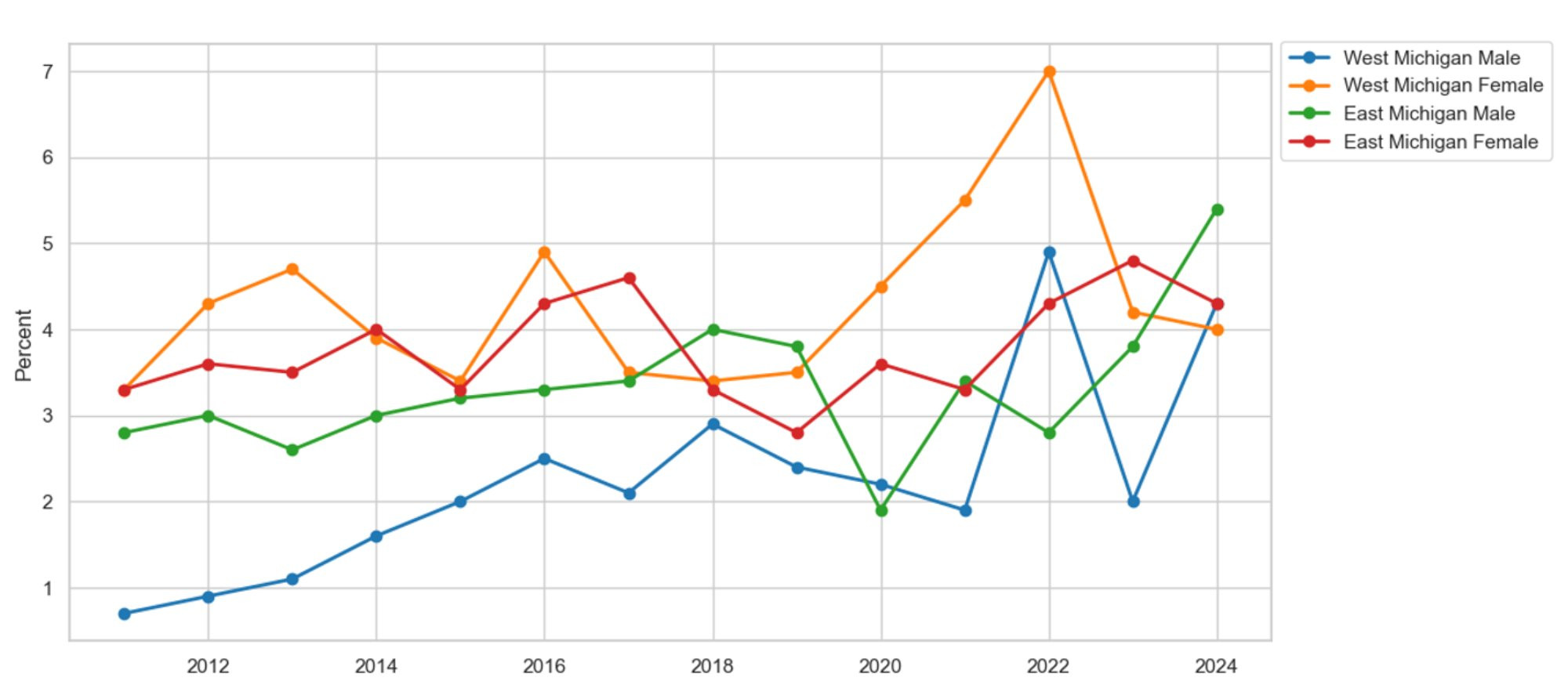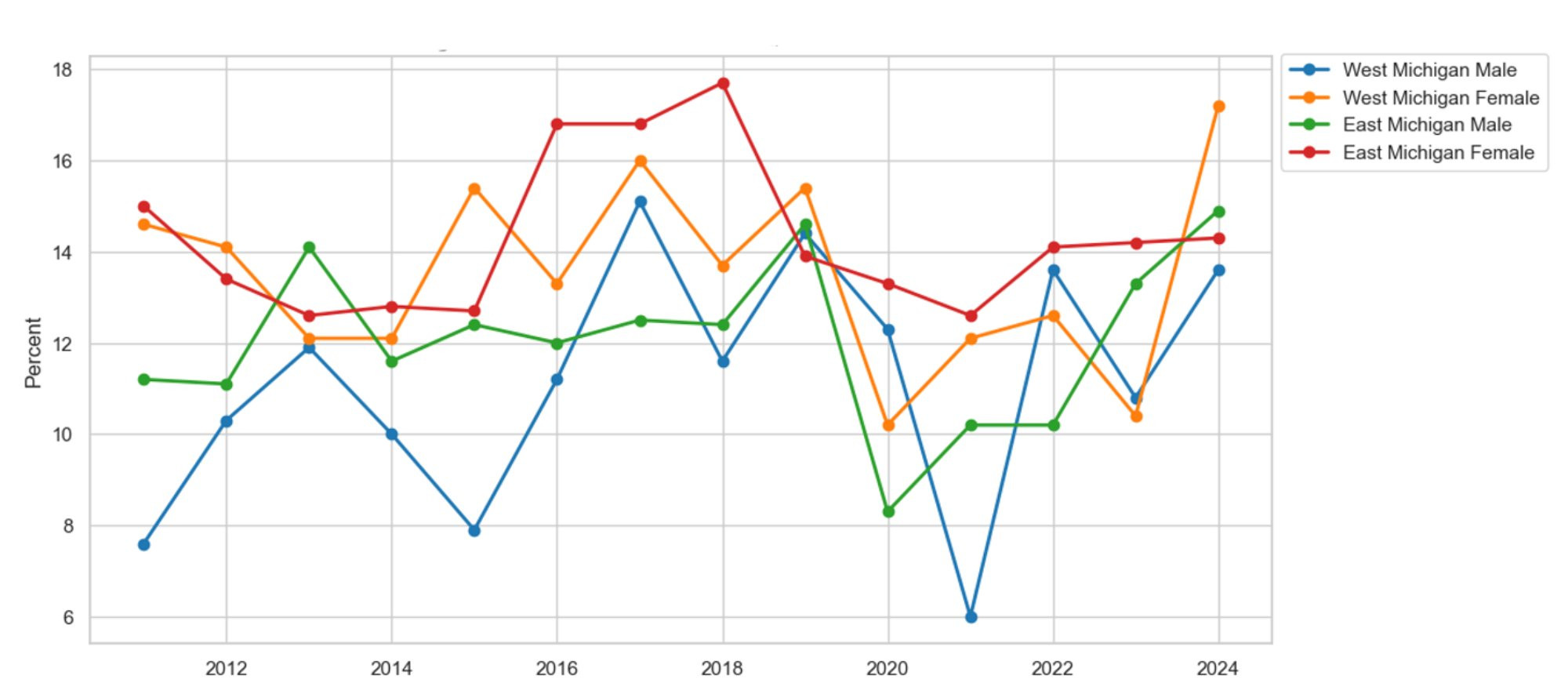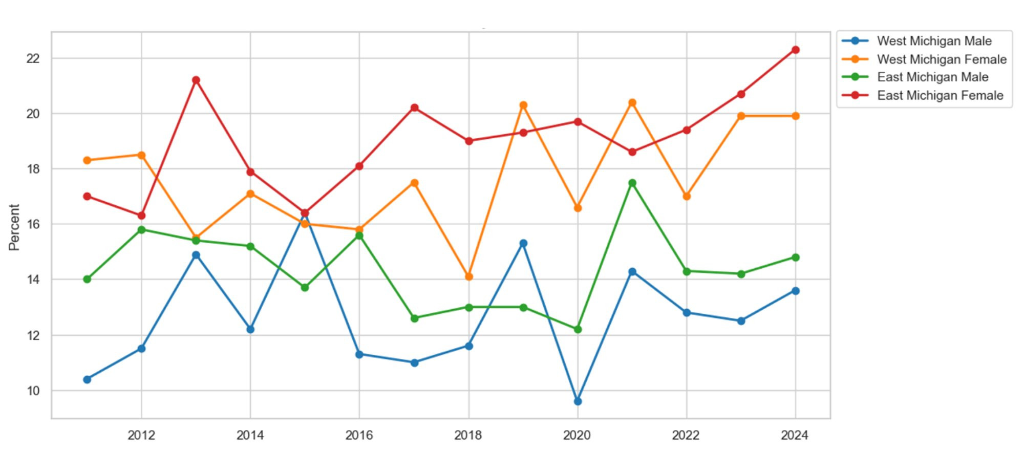 Description: Figure 23 displays the percentage of survey respondents by gender in East and West Michigan who report having a depression diagnosis or experiencing 14 or more poor mental health days in the past month. On average, depression has been increasing regardless of gender and region, with no apparent difference between genders.