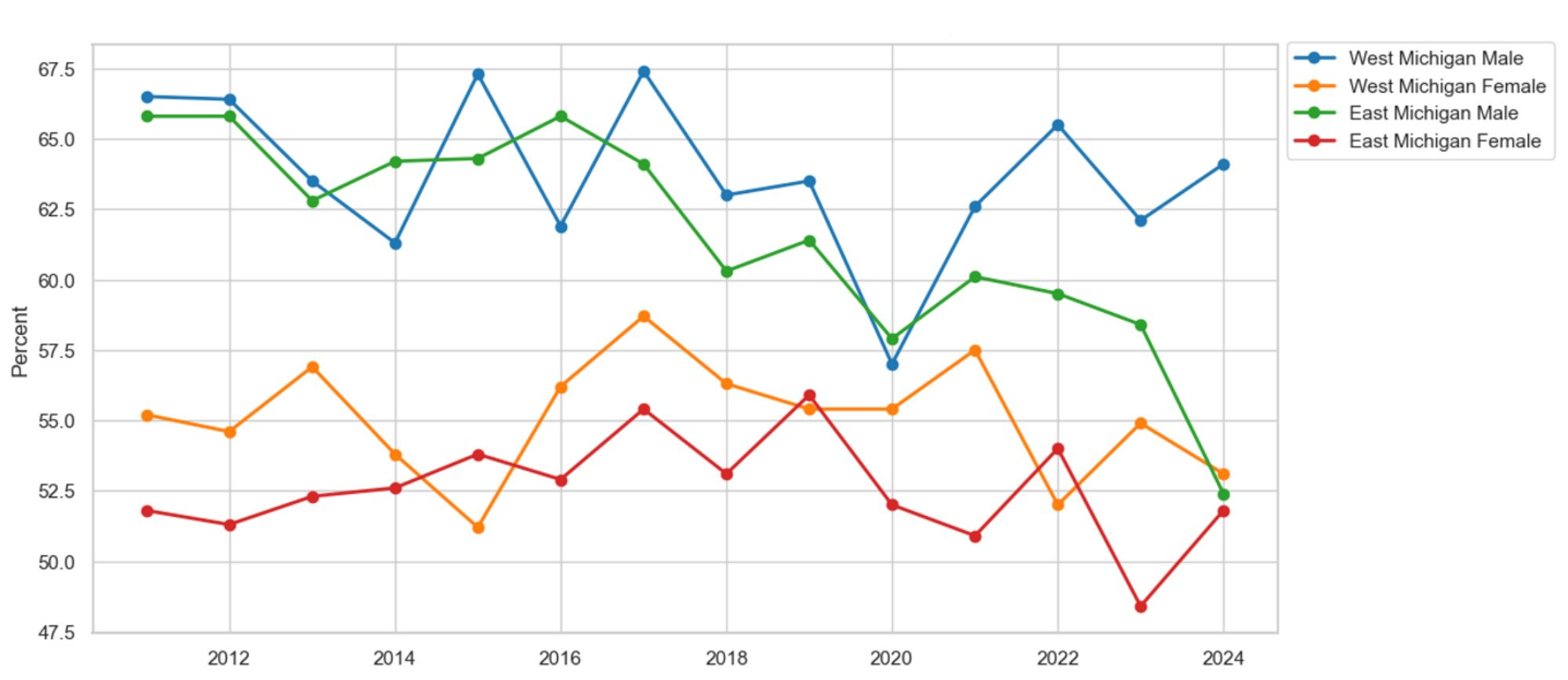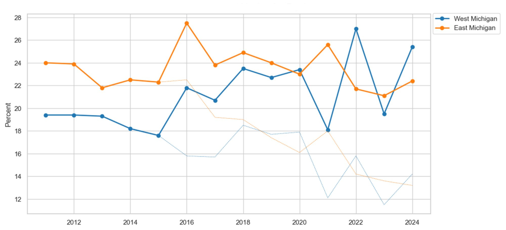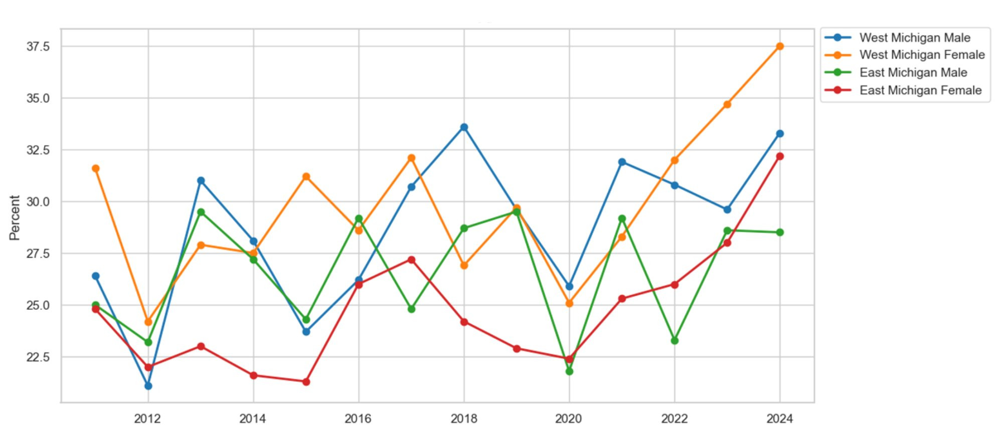 Description: Figure 24 displays the percentage of survey respondents who report having consumed alcohol in the past month in East and West Michigan. On average, alcohol consumption is higher in West Michigan than in East Michigan. Additionally, alcohol consumption is declining in East Michigan, while it remains relatively stable in West Michigan.