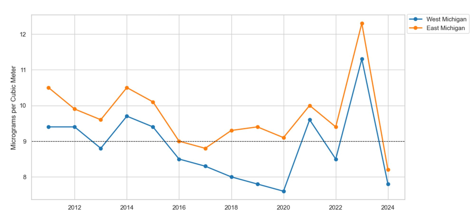 Description: Figure 4 illustrates the amount of particulate matter (2.5) air pollution per cubic meter of air in East and West Michigan compared to the EPA’s healthy environment goal of 9 micrograms per cubic meter or less. The graphs show that both East and West Michigan consistently exceed the EPA’s recommended pollution levels. Additionally, both regions experienced a spike in air pollution in 2023, which aligns with an increase in lung-related illnesses. On average, East Michigan reports higher pollution levels than West Michigan.
