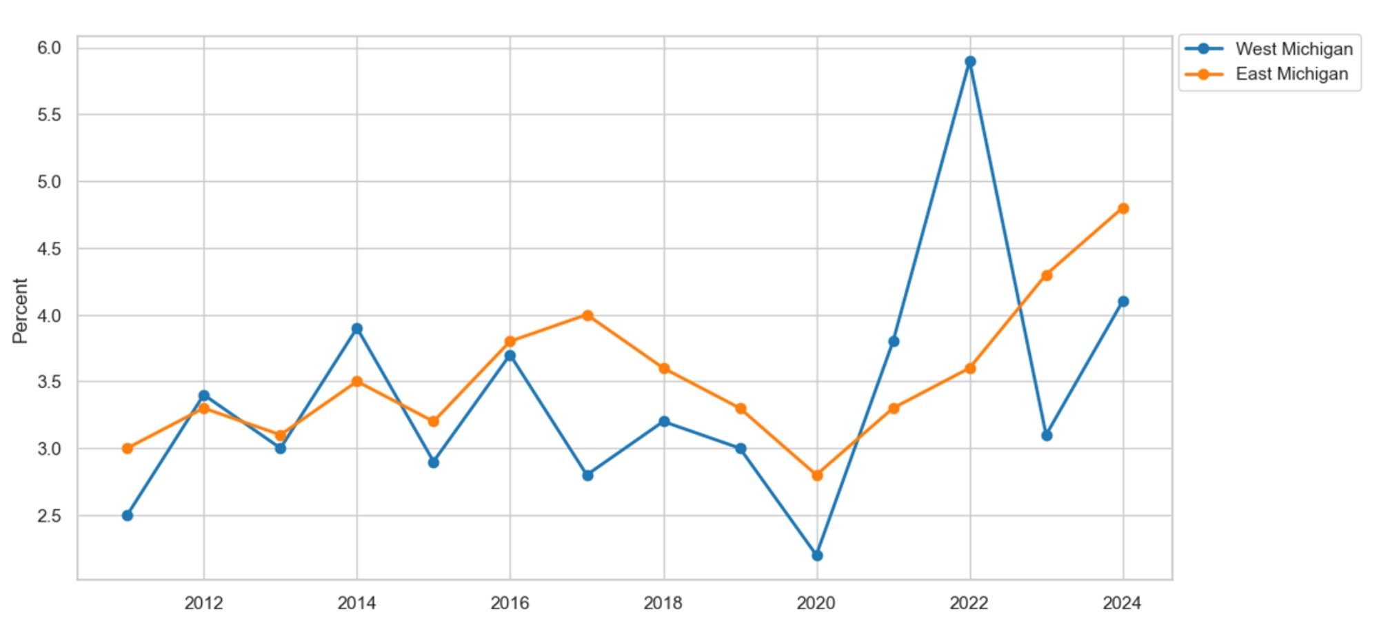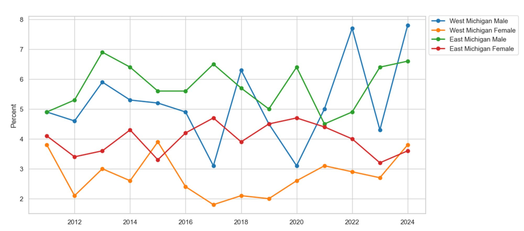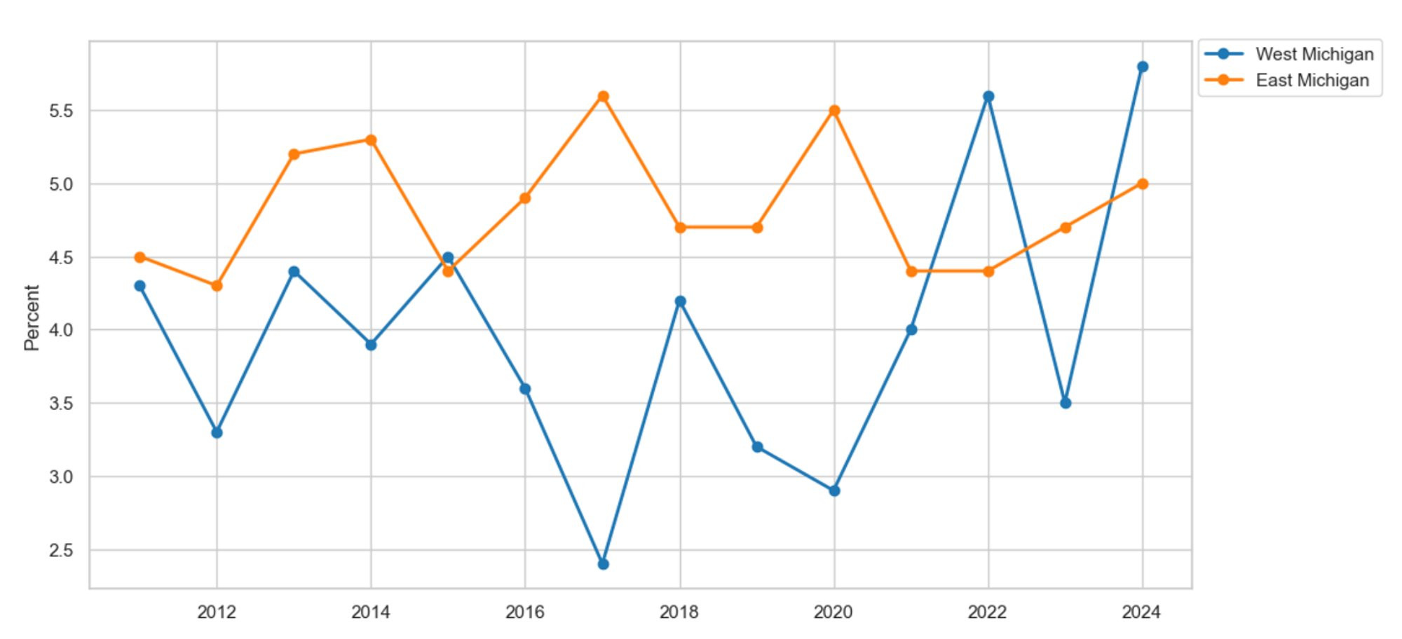 Description: Figure 5 illustrates the proportion of survey respondents reporting heart disease in East and West Michigan. Overall, the prevalence of heart disease has remained fairly steady. However, in East Michigan, heart disease started to increase in 2022. Meanwhile, heart disease in West Michigan hit a new high in 2024.