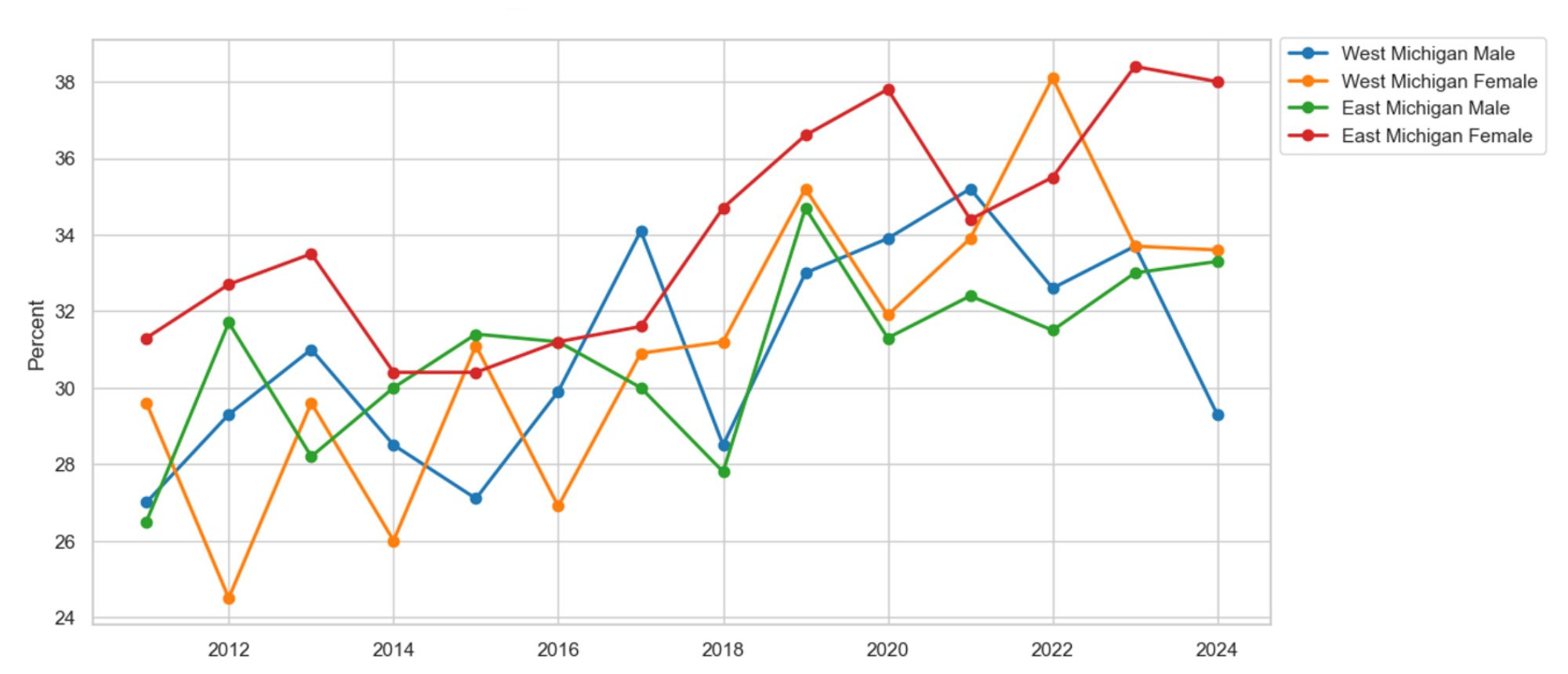 Description: Figure 9 shows the percentage of survey respondents identifying as obese by gender in East and West Michigan. Overall, obesity has been rising in both East and West Michigan, regardless of gender, since 2011. On average, females report a higher obesity rate than males in both regions.