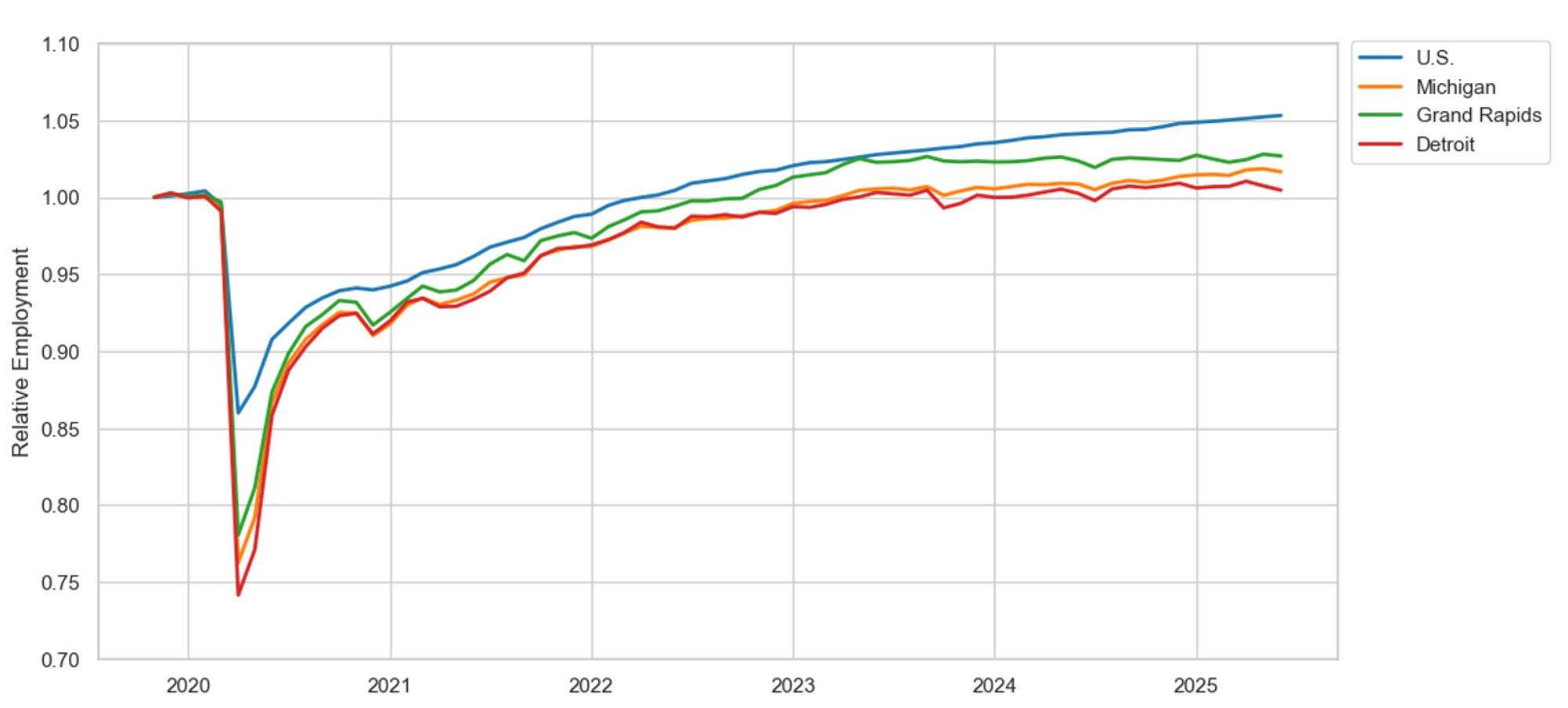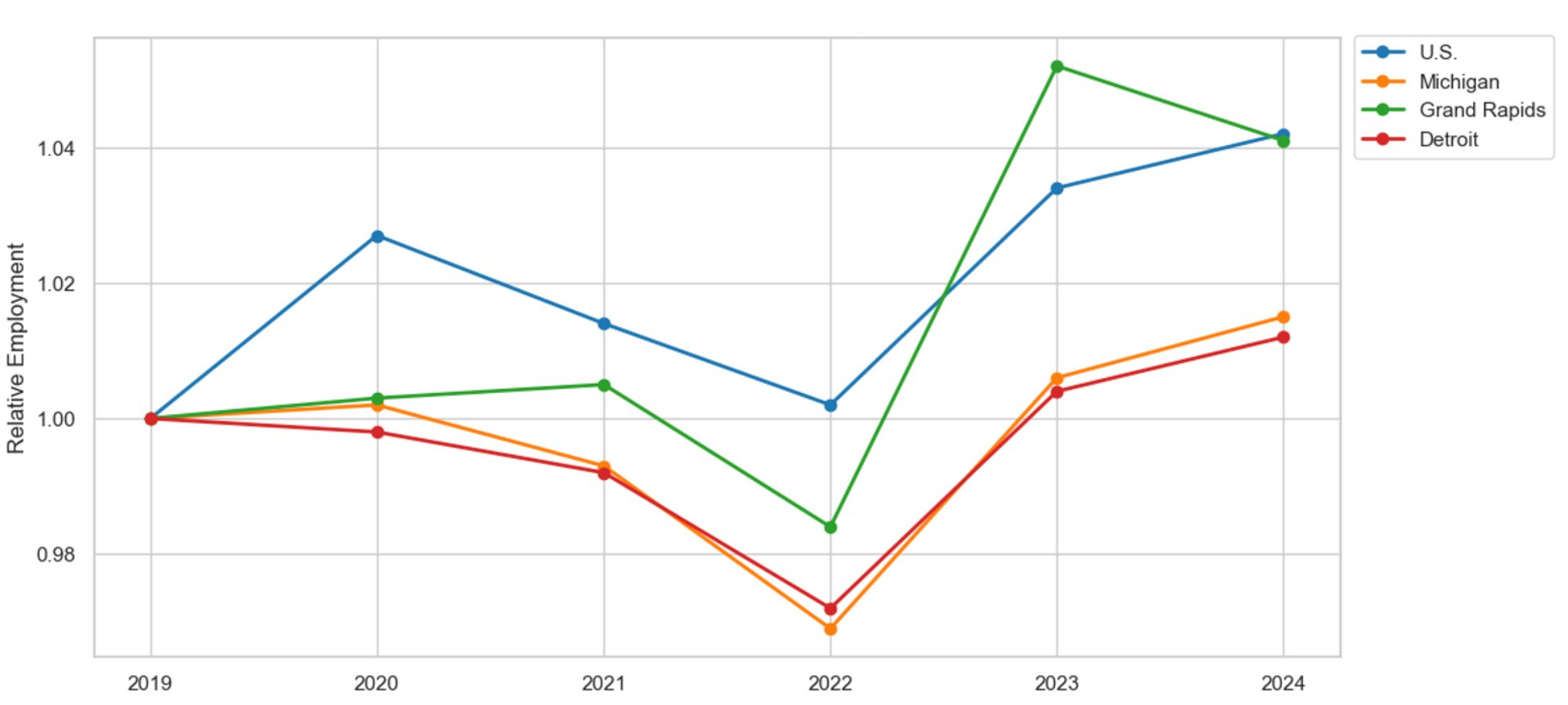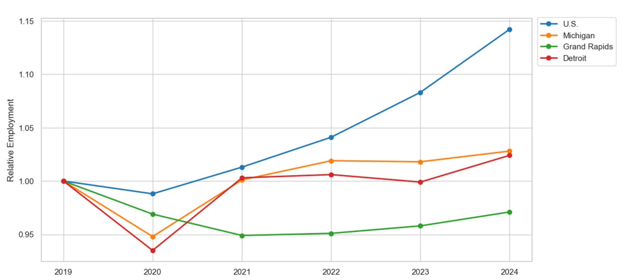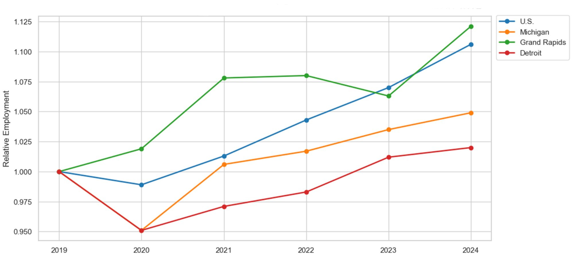 Figures 1 and 2 present the total non-farm employment relative to the start of the Great Recession in 2005 and the COVID-19 pandemic in 2019 for the U.S., Michigan, Grand Rapids, and Detroit. We find that Grand Rapids has recovered from the Great Recession at a rate comparable to the national average. For example, since 2005, Grand Rapids and the U.S. have observed net employment gains of 18.7 percent and 20.3 percent, respectively. By 2013, employment in Grand Rapids had returned to its pre-recession level, which lagged the national average by a year. In comparison, Detroit employment did not return to its pre-recession level until 2019. By 2025, Detroit will have recorded only a net employment gain of 0.5 percent, lagging far behind Grand Rapids. The data suggests that Detroit never really recovered from the Great Recession before being hit with the COVID-19 pandemic.