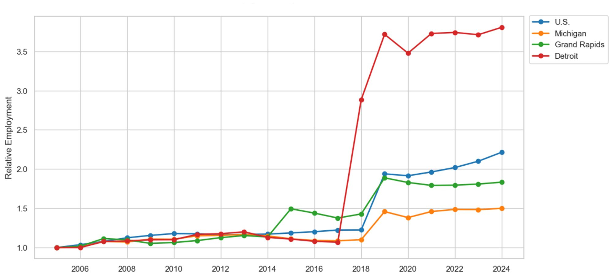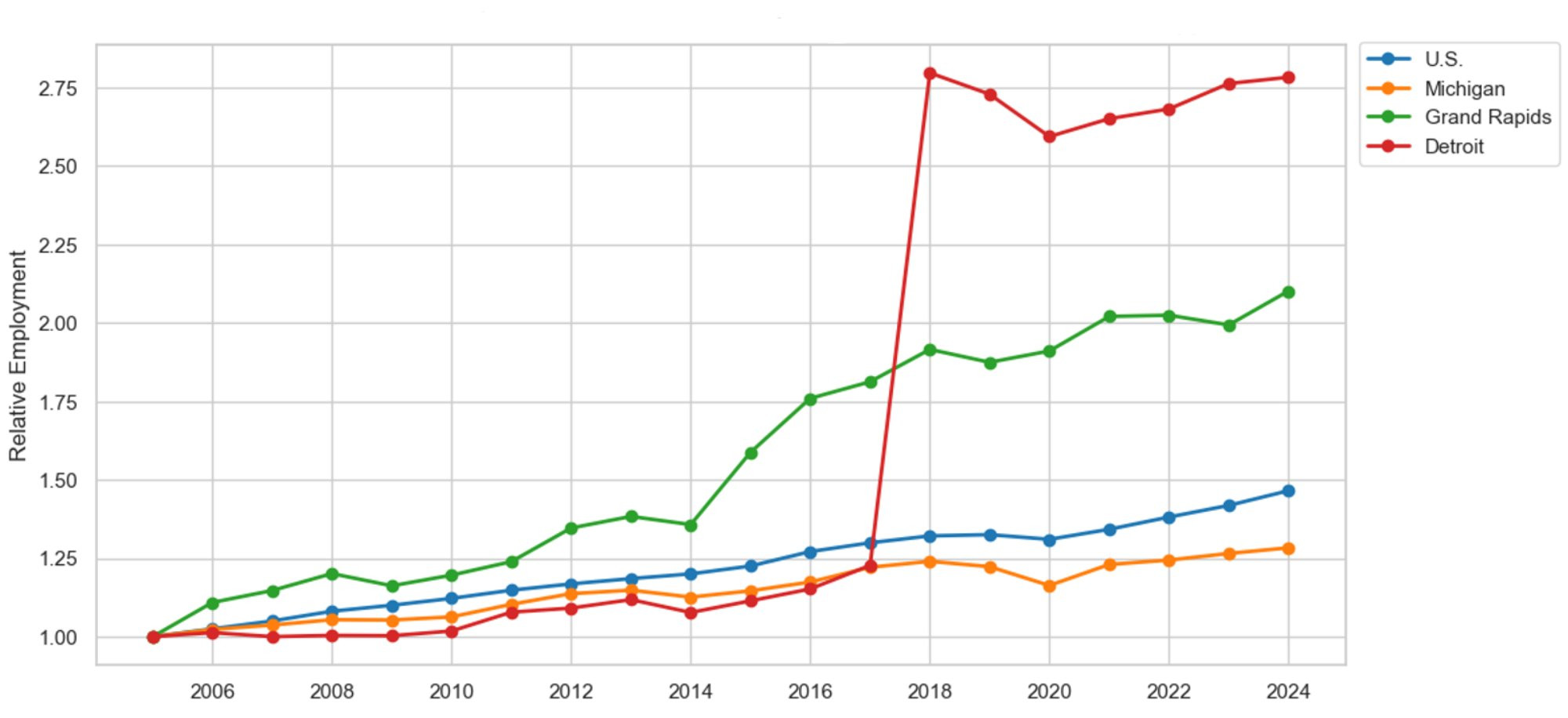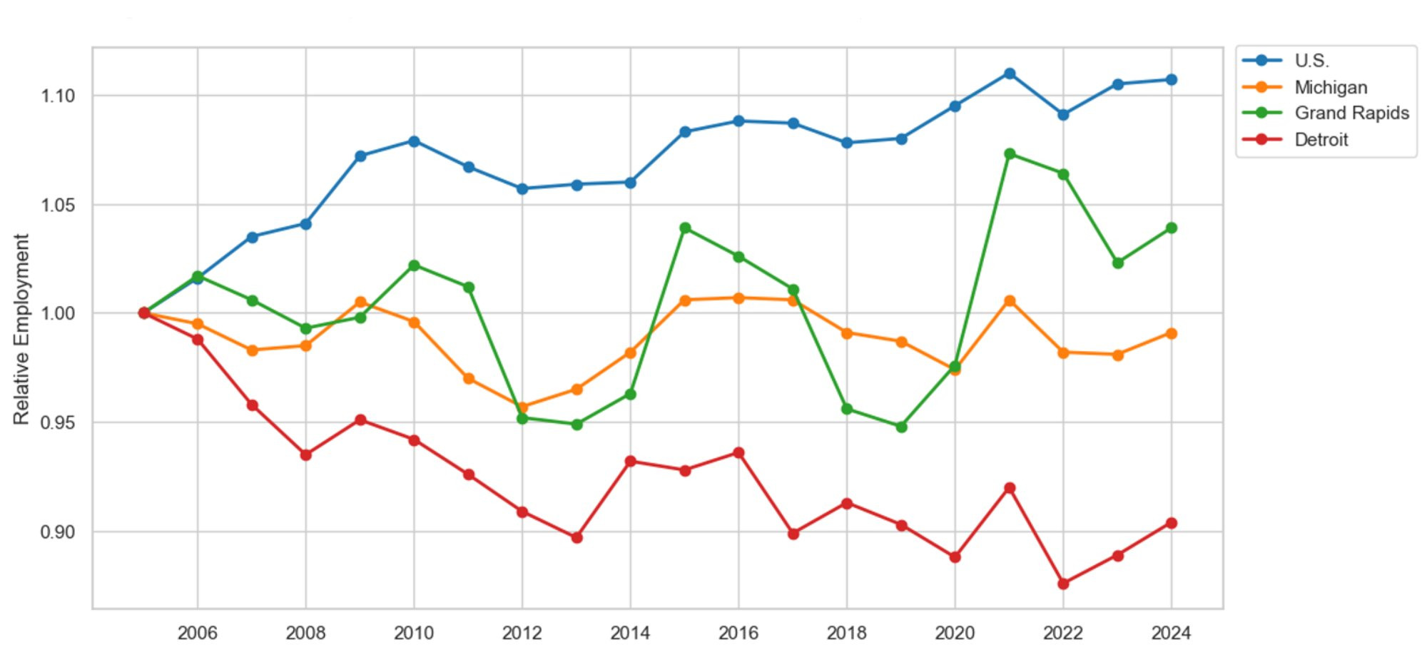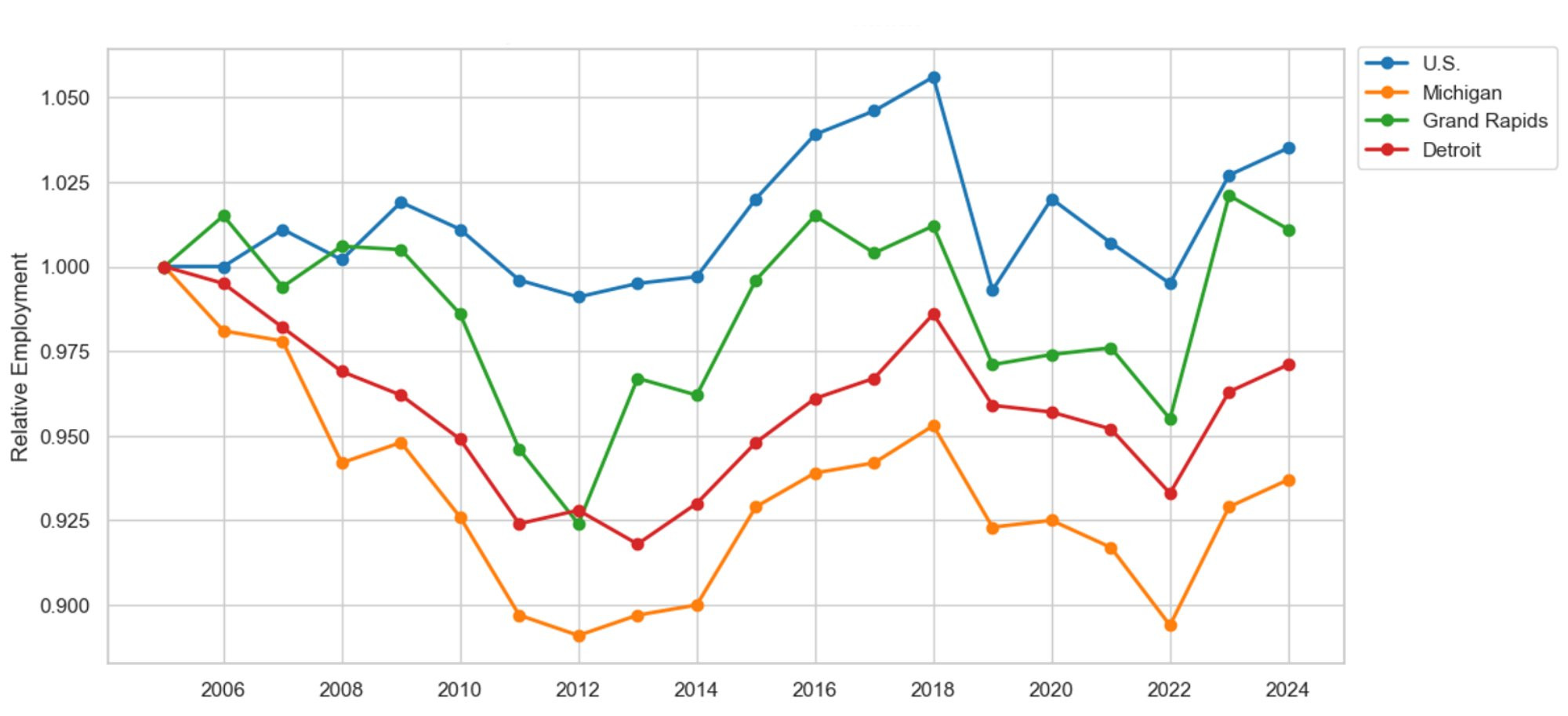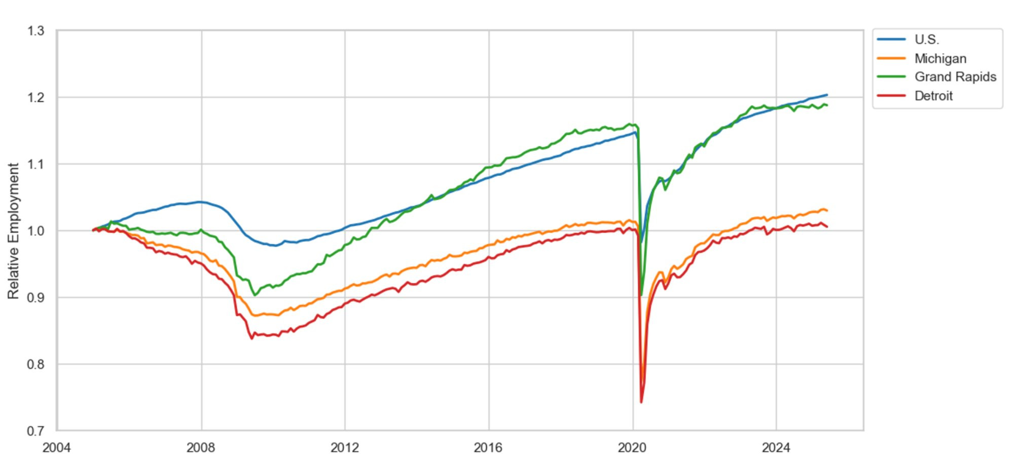 Figures 1 and 2 present the total non-farm employment relative to the start of the Great Recession in 2005 and the COVID-19 pandemic in 2019 for the U.S., Michigan, Grand Rapids, and Detroit. We find that Grand Rapids has recovered from the Great Recession at a rate comparable to the national average. For example, since 2005, Grand Rapids and the U.S. have observed net employment gains of 18.7 percent and 20.3 percent, respectively. By 2013, employment in Grand Rapids had returned to its pre-recession level, which lagged the national average by a year. In comparison, Detroit employment did not return to its pre-recession level until 2019. By 2025, Detroit will have recorded only a net employment gain of 0.5 percent, lagging far behind Grand Rapids. The data suggests that Detroit never really recovered from the Great Recession before being hit with the COVID-19 pandemic.