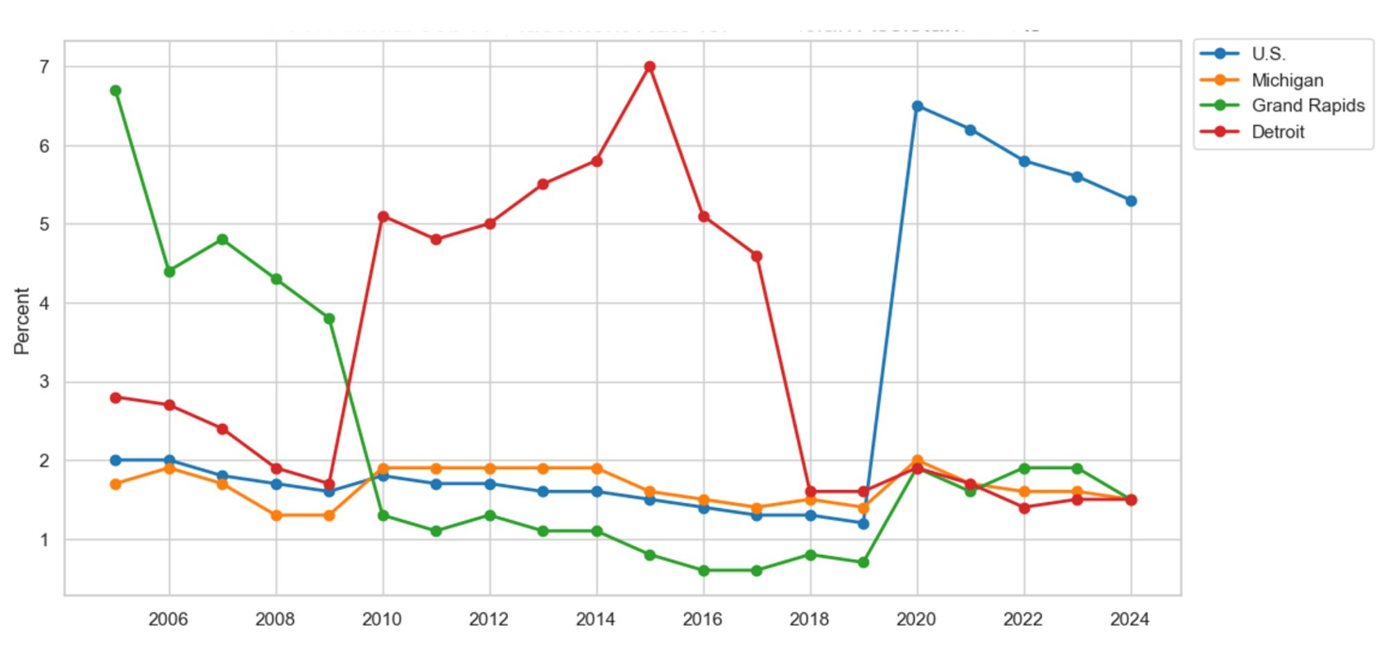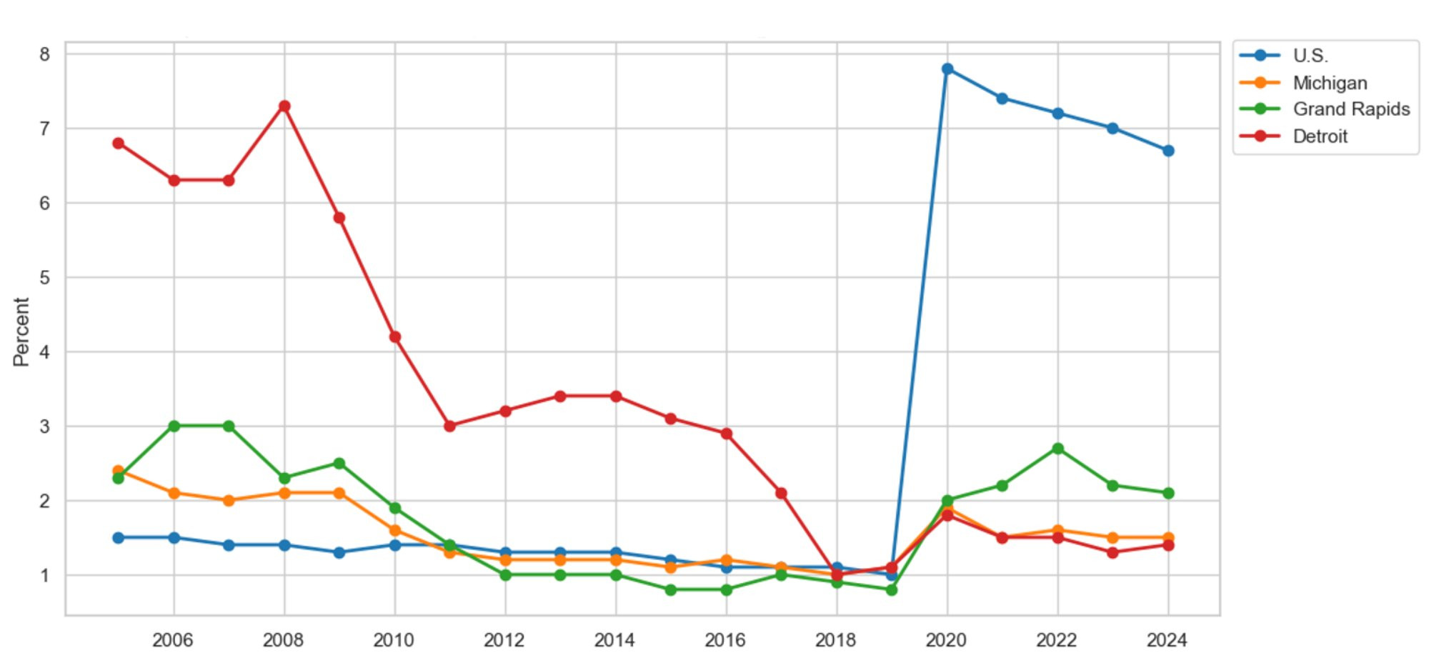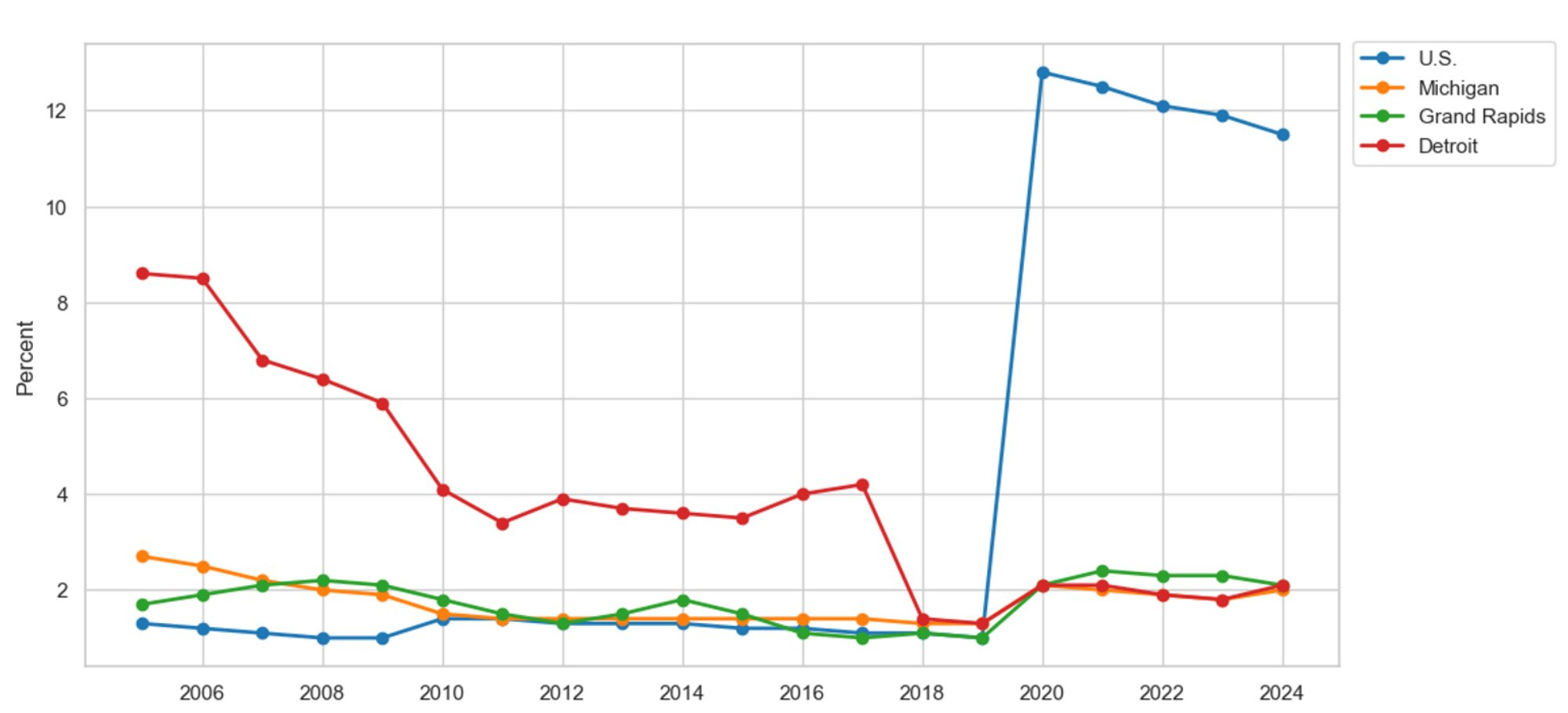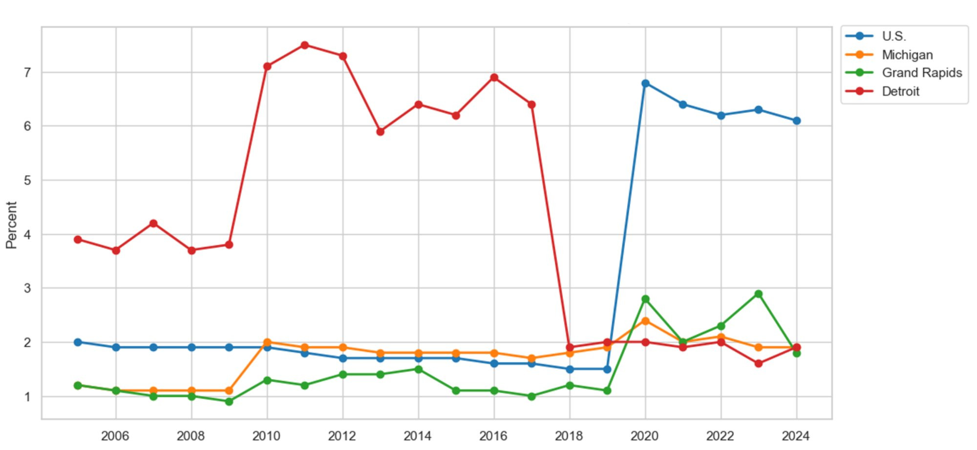 Figures 1 and 2 present the total non-farm employment relative to the start of the Great Recession in 2005 and the COVID-19 pandemic in 2019 for the U.S., Michigan, Grand Rapids, and Detroit. We find that Grand Rapids has recovered from the Great Recession at a rate comparable to the national average. For example, since 2005, Grand Rapids and the U.S. have observed net employment gains of 18.7 percent and 20.3 percent, respectively. By 2013, employment in Grand Rapids had returned to its pre-recession level, which lagged the national average by a year. In comparison, Detroit employment did not return to its pre-recession level until 2019. By 2025, Detroit will have recorded only a net employment gain of 0.5 percent, lagging far behind Grand Rapids. The data suggests that Detroit never really recovered from the Great Recession before being hit with the COVID-19 pandemic.