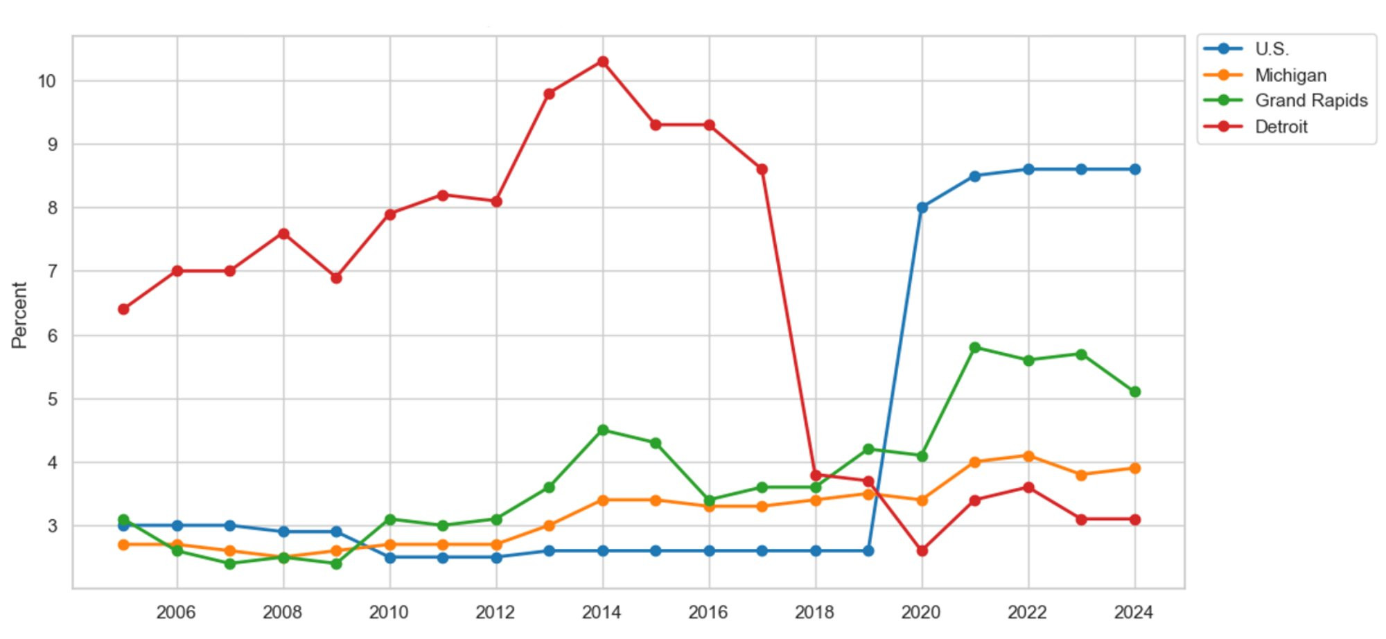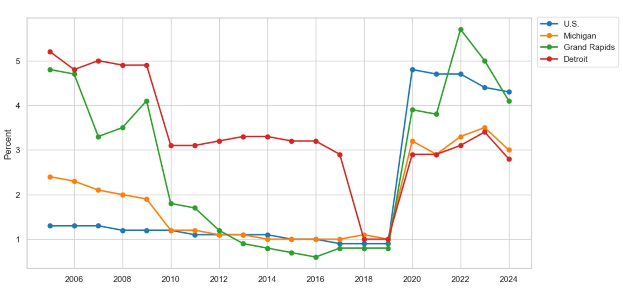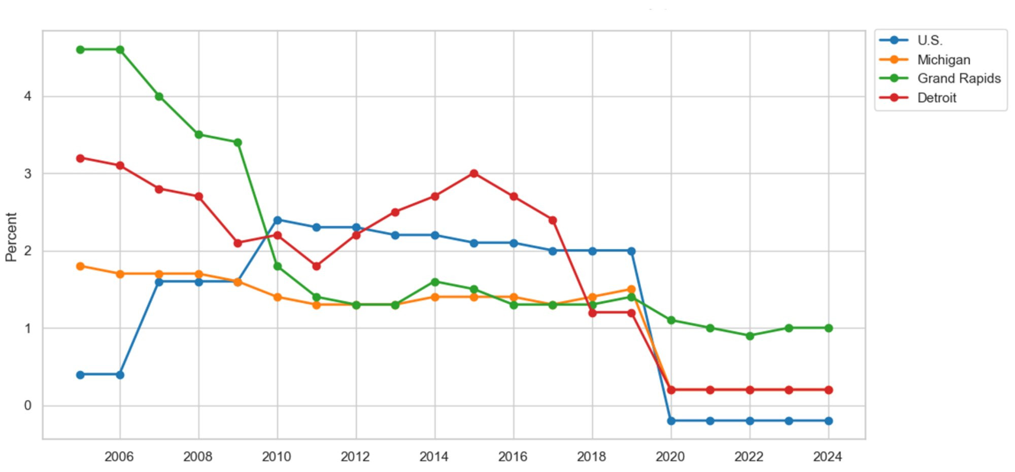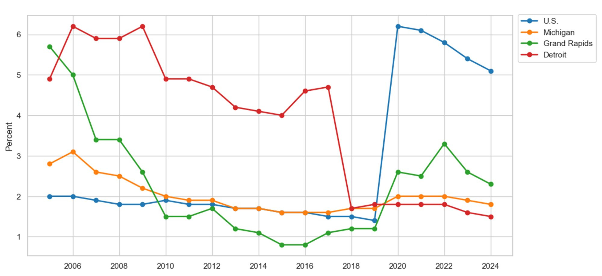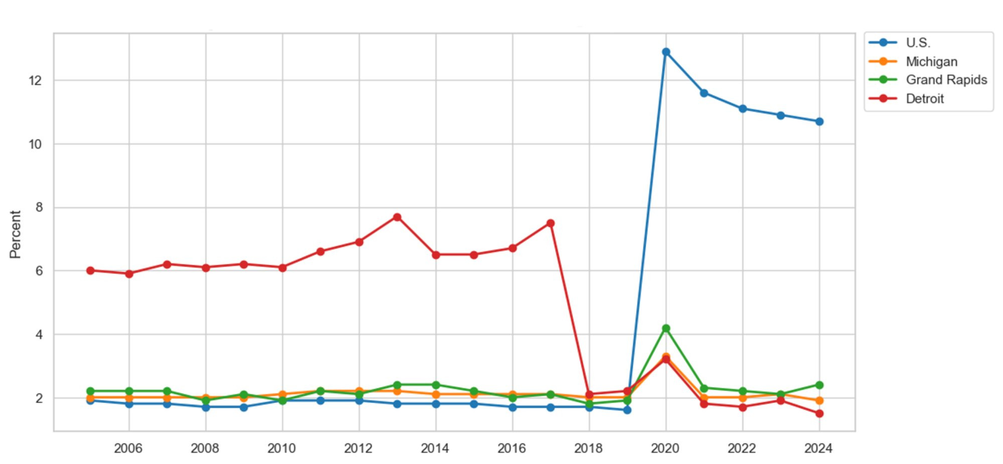 Figures 1 and 2 present the total non-farm employment relative to the start of the Great Recession in 2005 and the COVID-19 pandemic in 2019 for the U.S., Michigan, Grand Rapids, and Detroit. We find that Grand Rapids has recovered from the Great Recession at a rate comparable to the national average. For example, since 2005, Grand Rapids and the U.S. have observed net employment gains of 18.7 percent and 20.3 percent, respectively. By 2013, employment in Grand Rapids had returned to its pre-recession level, which lagged the national average by a year. In comparison, Detroit employment did not return to its pre-recession level until 2019. By 2025, Detroit will have recorded only a net employment gain of 0.5 percent, lagging far behind Grand Rapids. The data suggests that Detroit never really recovered from the Great Recession before being hit with the COVID-19 pandemic.