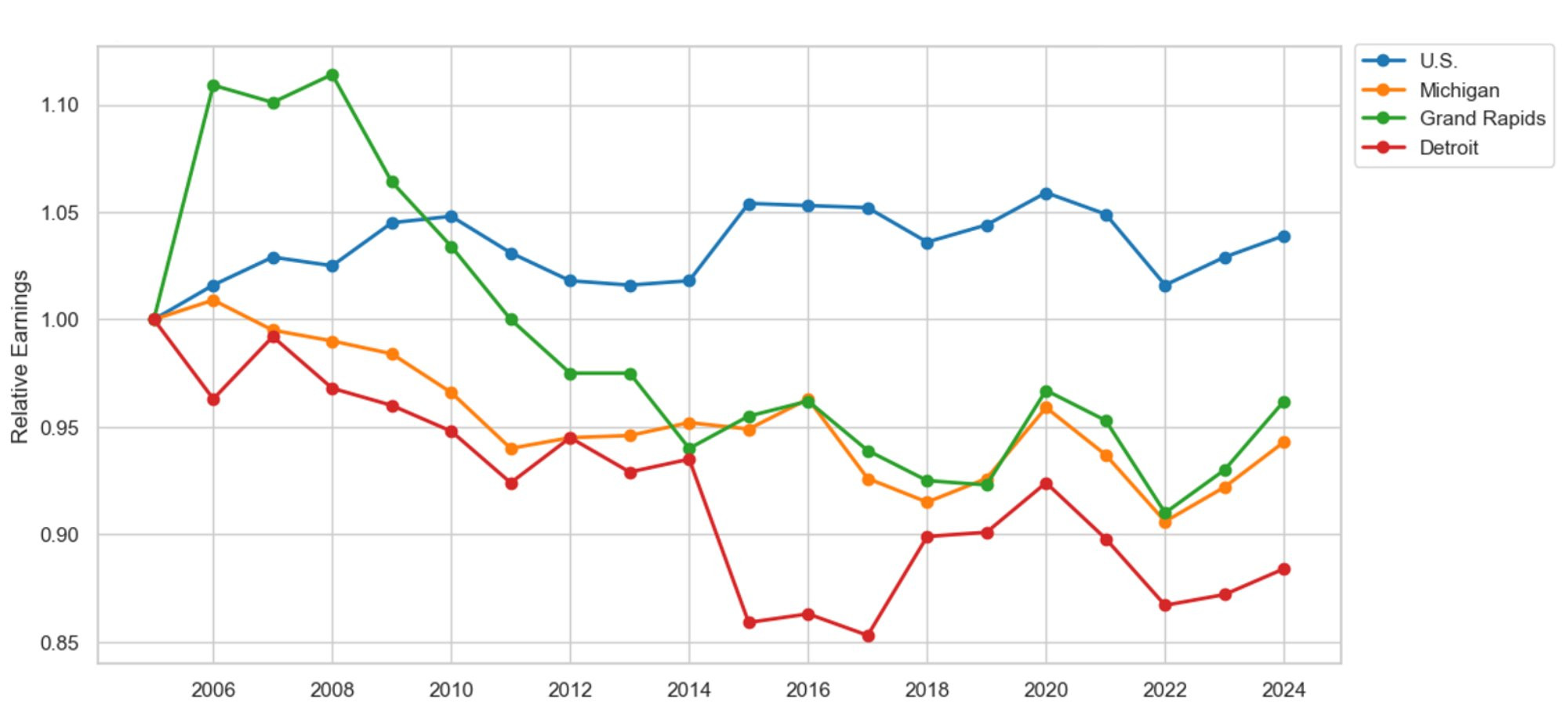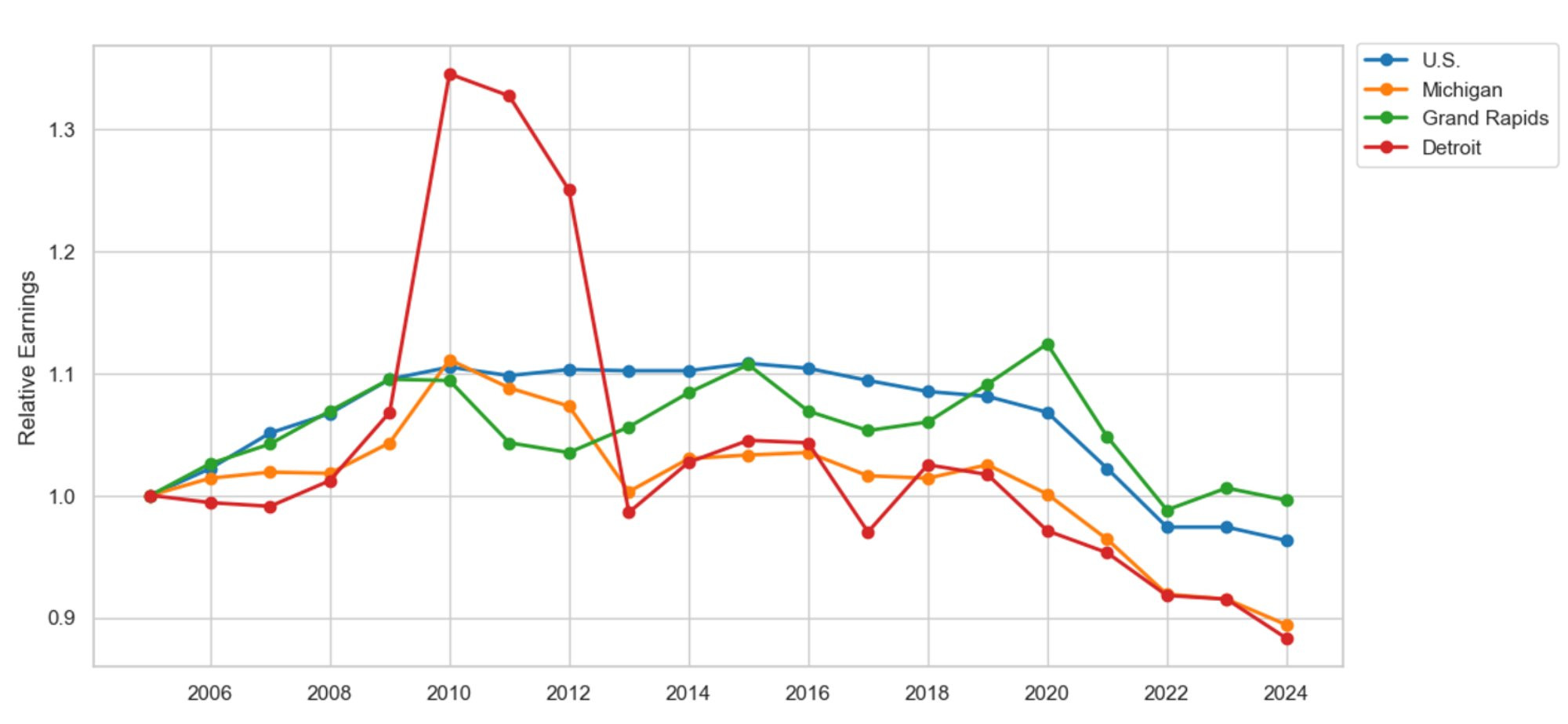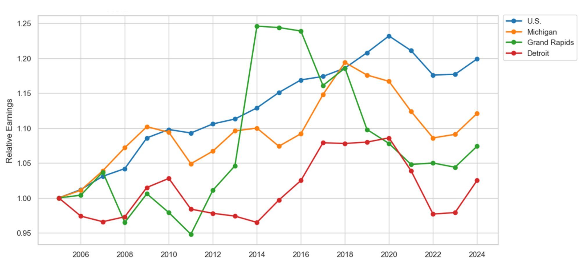 Figure 8 presents the relative inflation-adjusted earnings of healthcare practitioners and technical occupations in the U.S., Michigan, Grand Rapids, and Detroit since 2005. Since 2005, the inflation-adjusted incomes of healthcare practitioners and technical workers in Grand Rapids and Detroit have not kept pace with the national average. The inflation-adjusted earnings of healthcare workers have increased by 10.7 percent nationally. Meanwhile, the inflation-adjusted incomes of Grand Rapids-based healthcare workers have increased by only 3.9 percent during the same period, while earnings in Detroit have fallen by 9.6 percent. Figures 7 and 8 illustrate that healthcare providers in Grand Rapids and Detroit are getting more bang for their buck, paying less for talent than the national average, while attracting talent far beyond what is observed nationally. However, this finding also sounds a warning alarm; if pay does not keep pace with the national average, talent may find residence elsewhere. For example, suppose that national pay levels shape labor supply’s earnings expectations. In that case, the earnings observed in Grand Rapids and Detroit are not keeping pace with those expectations, which may prompt healthcare workers to seek employment elsewhere.