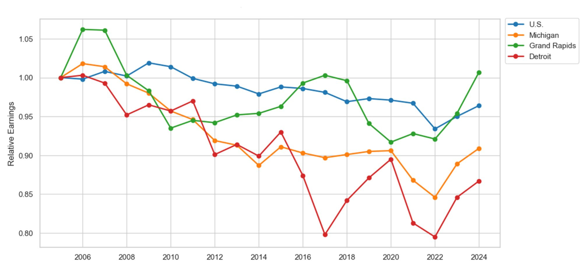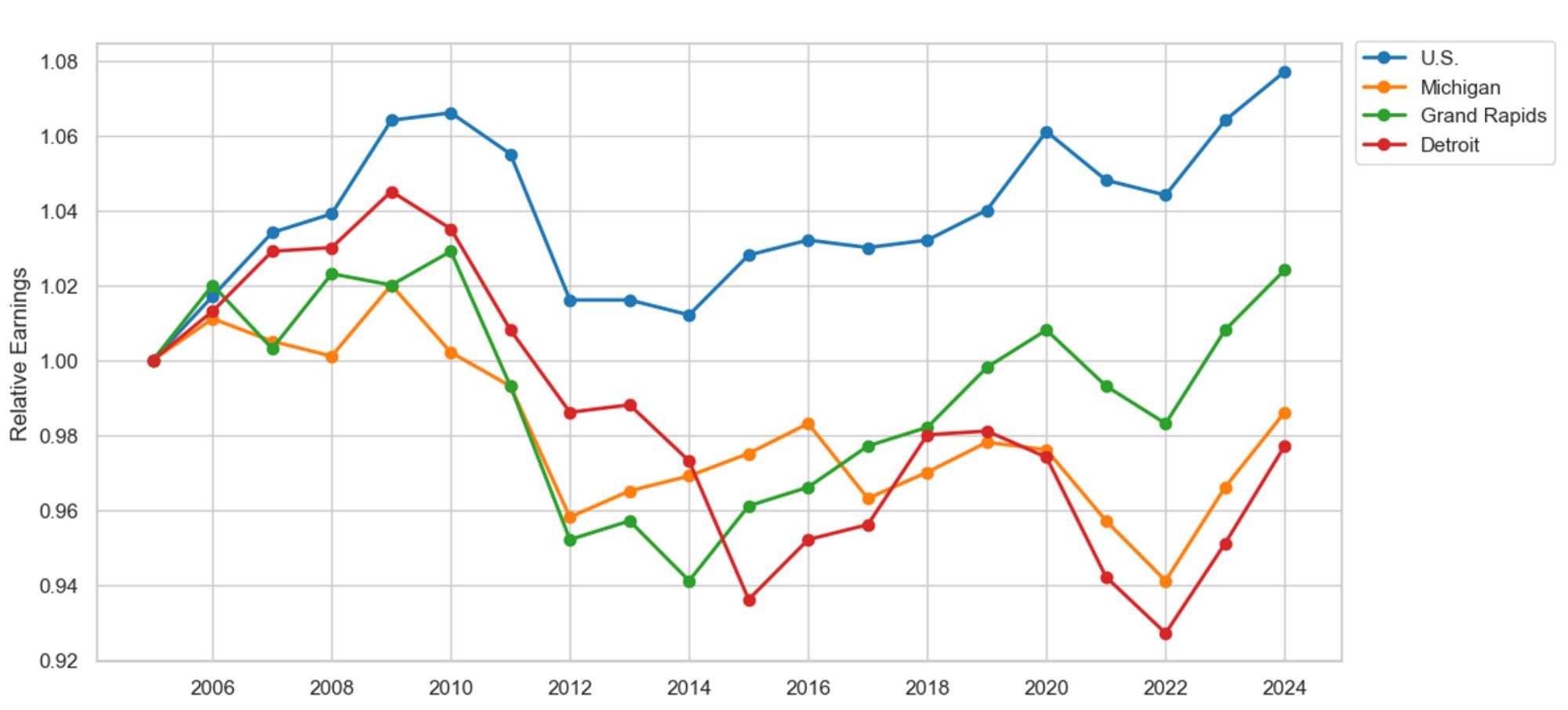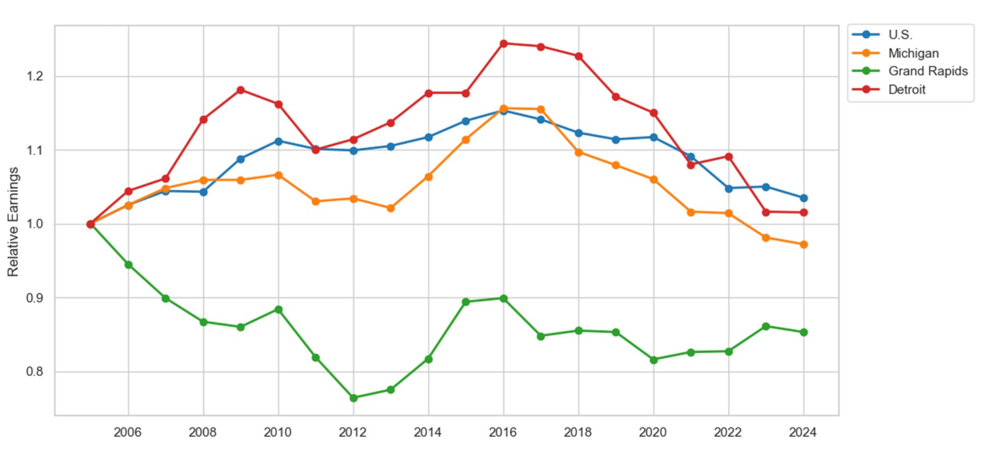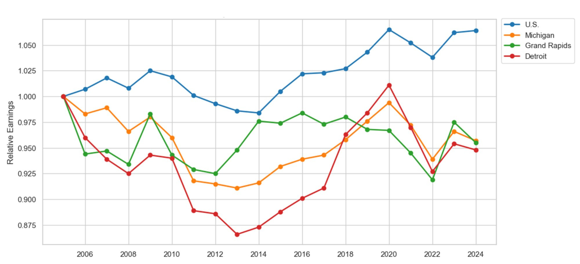 Figure 8 presents the relative inflation-adjusted earnings of healthcare practitioners and technical occupations in the U.S., Michigan, Grand Rapids, and Detroit since 2005. Since 2005, the inflation-adjusted incomes of healthcare practitioners and technical workers in Grand Rapids and Detroit have not kept pace with the national average. The inflation-adjusted earnings of healthcare workers have increased by 10.7 percent nationally. Meanwhile, the inflation-adjusted incomes of Grand Rapids-based healthcare workers have increased by only 3.9 percent during the same period, while earnings in Detroit have fallen by 9.6 percent. Figures 7 and 8 illustrate that healthcare providers in Grand Rapids and Detroit are getting more bang for their buck, paying less for talent than the national average, while attracting talent far beyond what is observed nationally. However, this finding also sounds a warning alarm; if pay does not keep pace with the national average, talent may find residence elsewhere. For example, suppose that national pay levels shape labor supply’s earnings expectations. In that case, the earnings observed in Grand Rapids and Detroit are not keeping pace with those expectations, which may prompt healthcare workers to seek employment elsewhere.