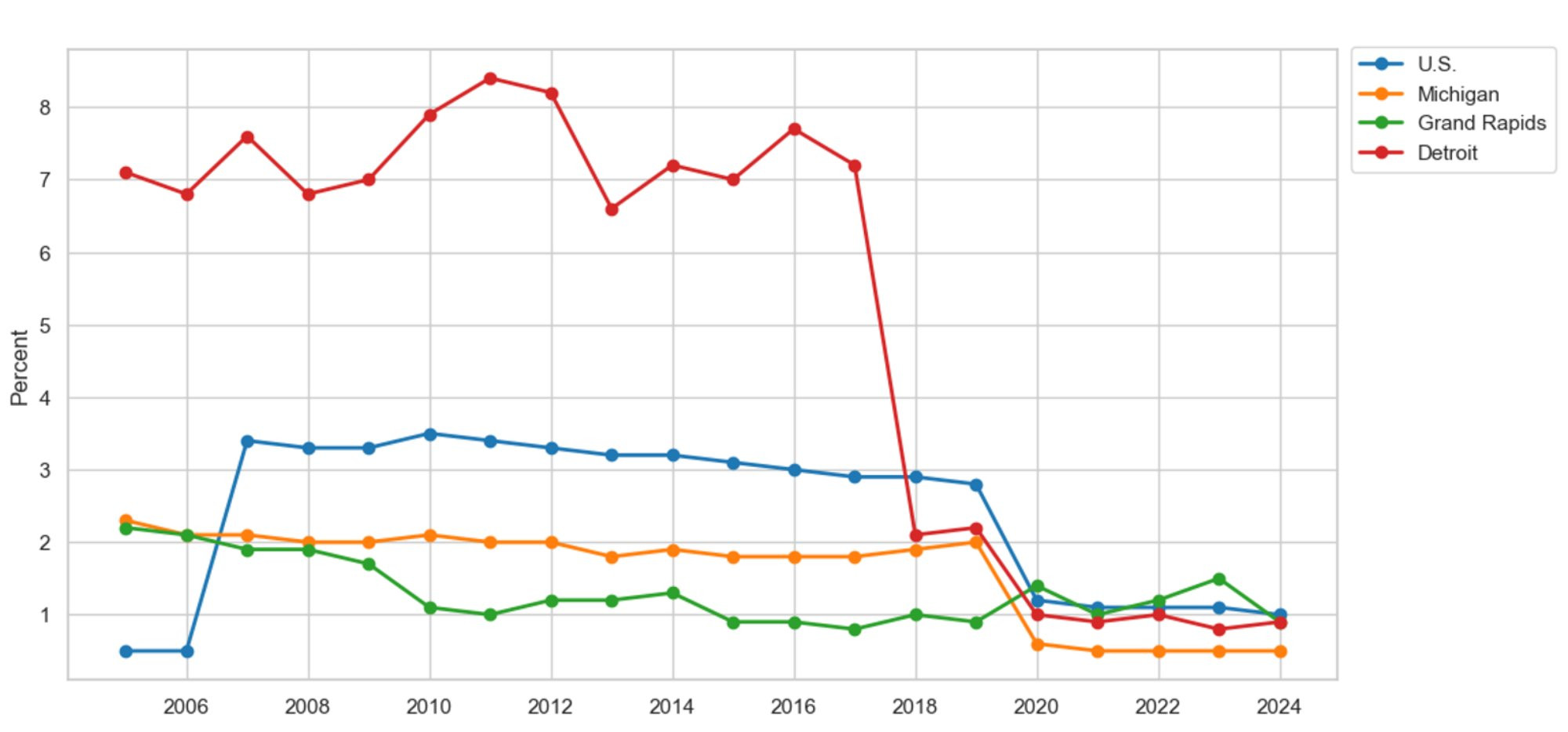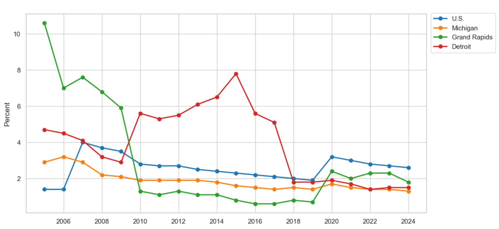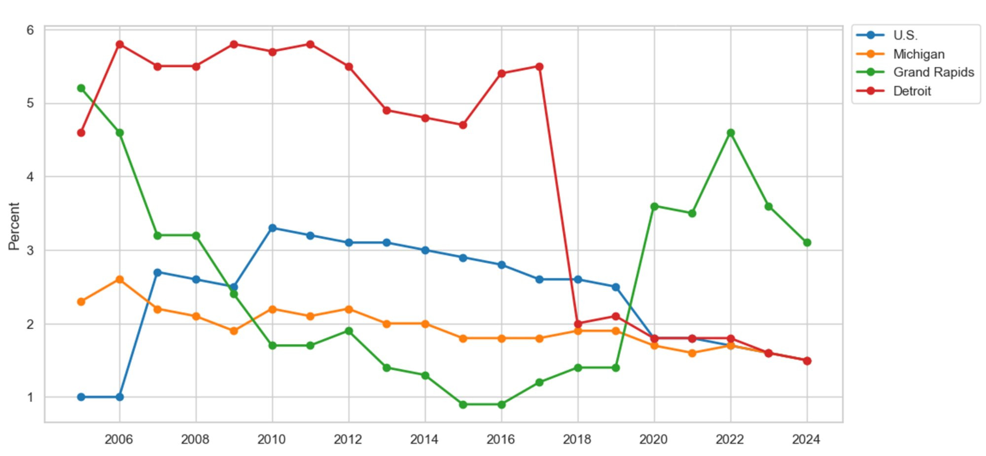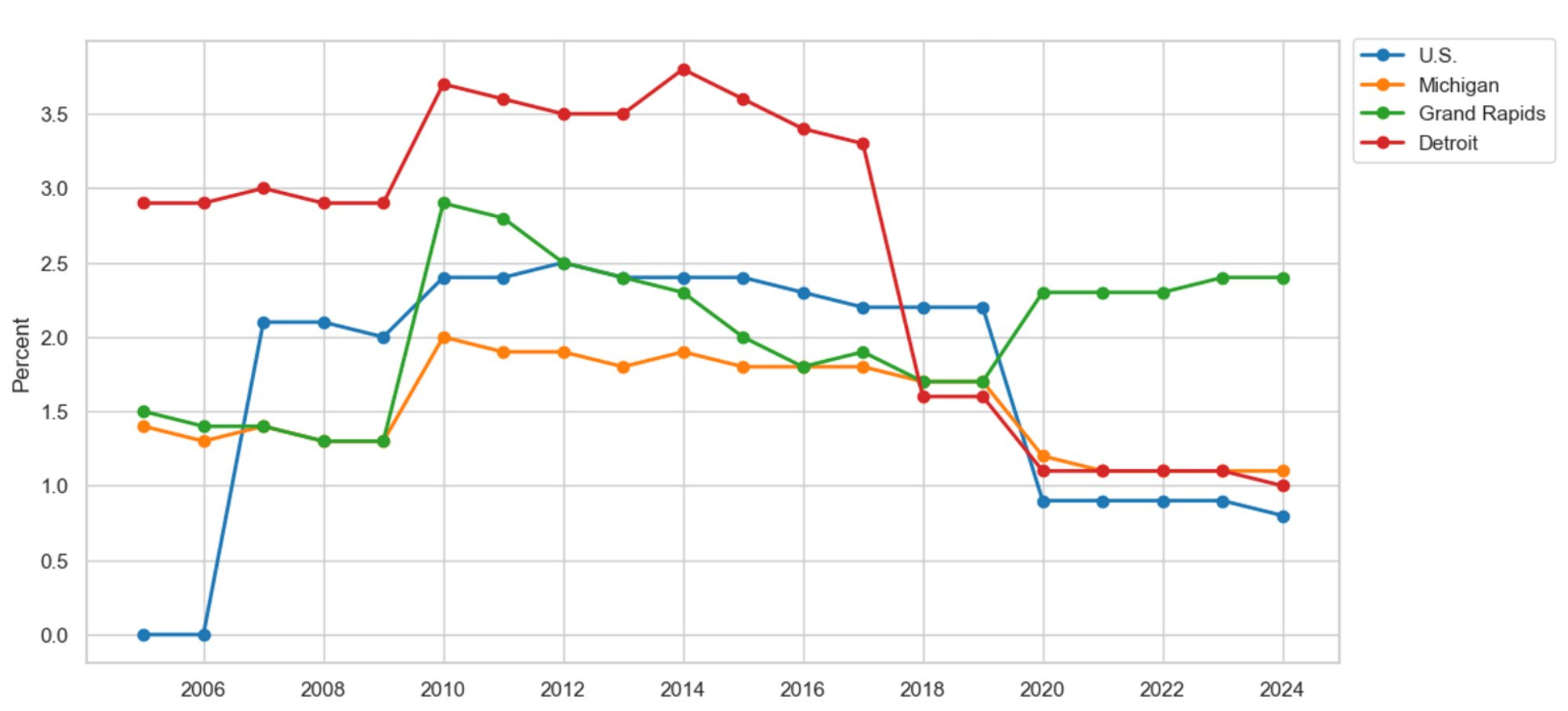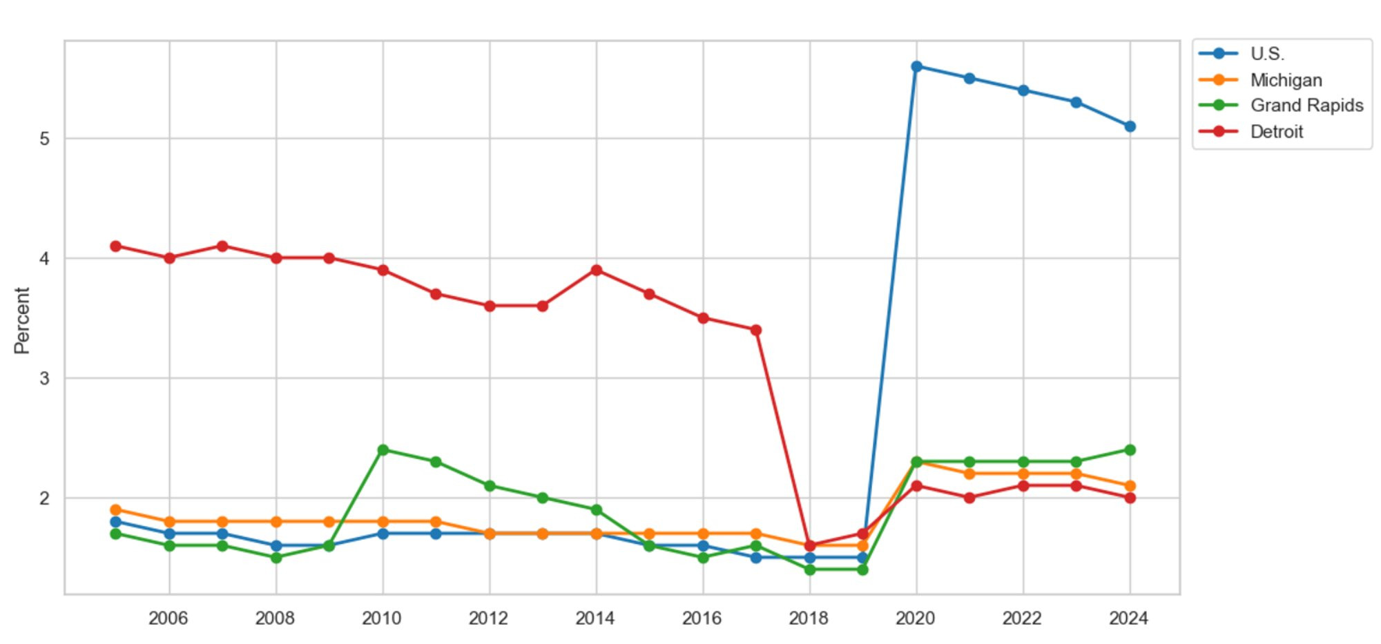 Figures 3 through 6 illustrate the evolution of industry employment since the onset of the Great Recession in the U.S., specifically in Michigan, including Grand Rapids and Detroit. Employment in each industry is taken as a percentage of total employment across all sectors to proxy the importance of that industry. All figures share a common trend: the relative importance of healthcare is increasing in all geographical samples. For example, healthcare practitioner and technical occupations, as well as healthcare support occupations, have collectively increased in Grand Rapids from 7.6 percent to 10.4 percent of total employment between 2005 and 2024. Healthcare is a vital component of West Michigan's economy, with 1 in 10 workers employed in the sector. Similar trends are found at the national and state levels. For example, healthcare as a percent of total employment has grown by 3.4 percent nationally, 2.7 percent at the state level, and by 3.4 percent in Detroit.