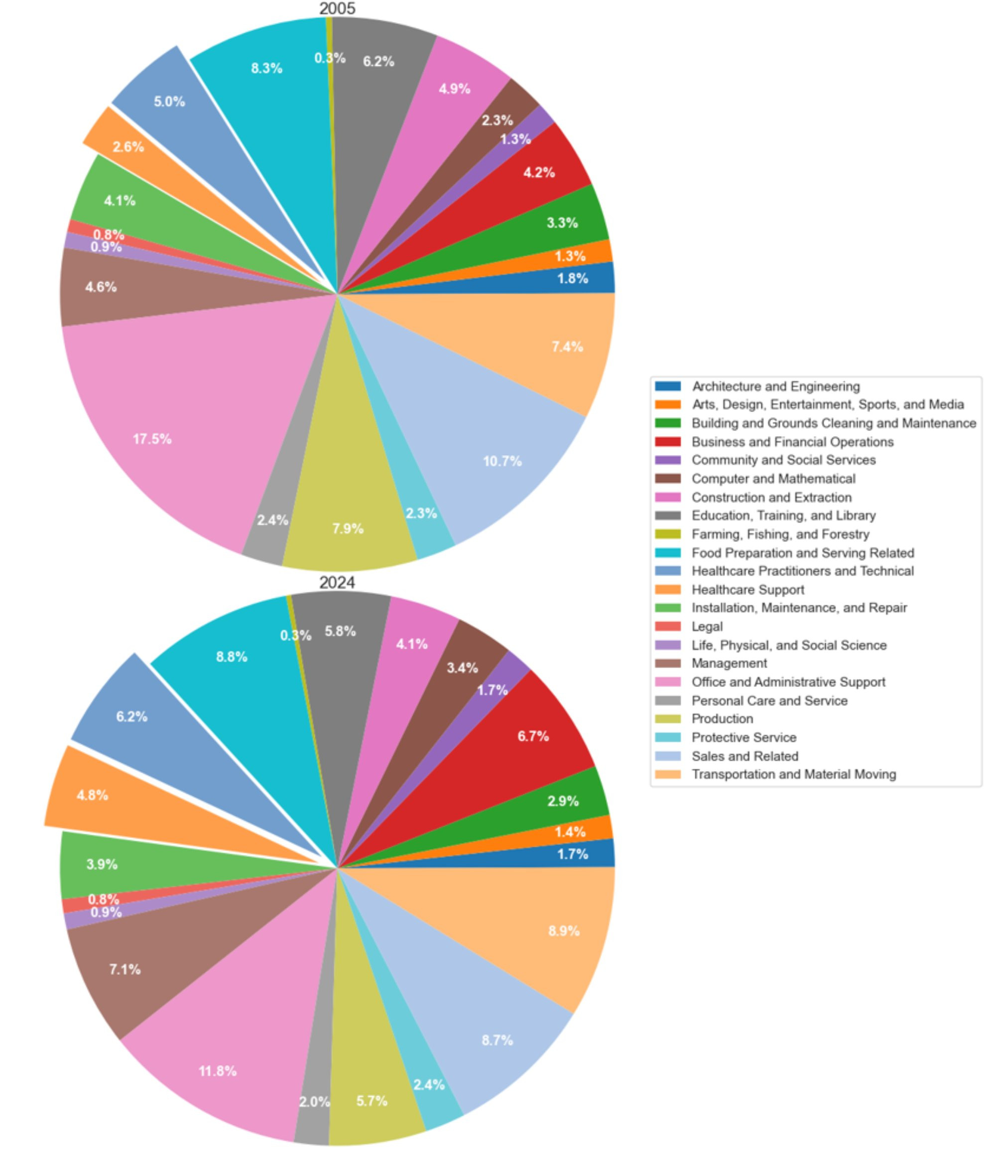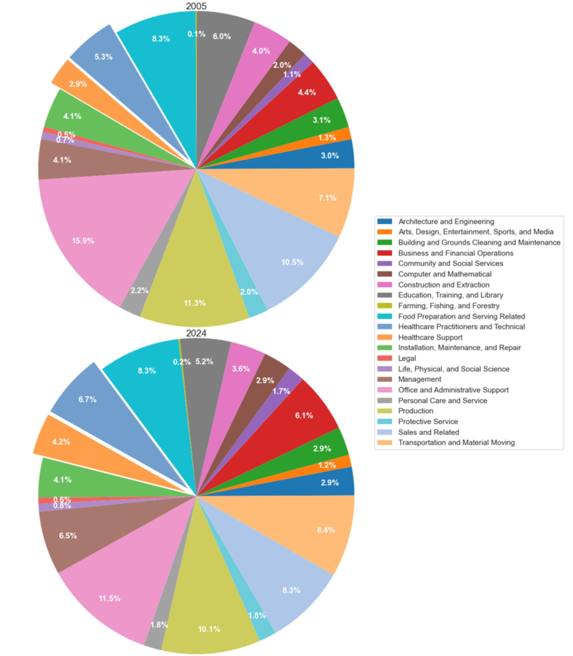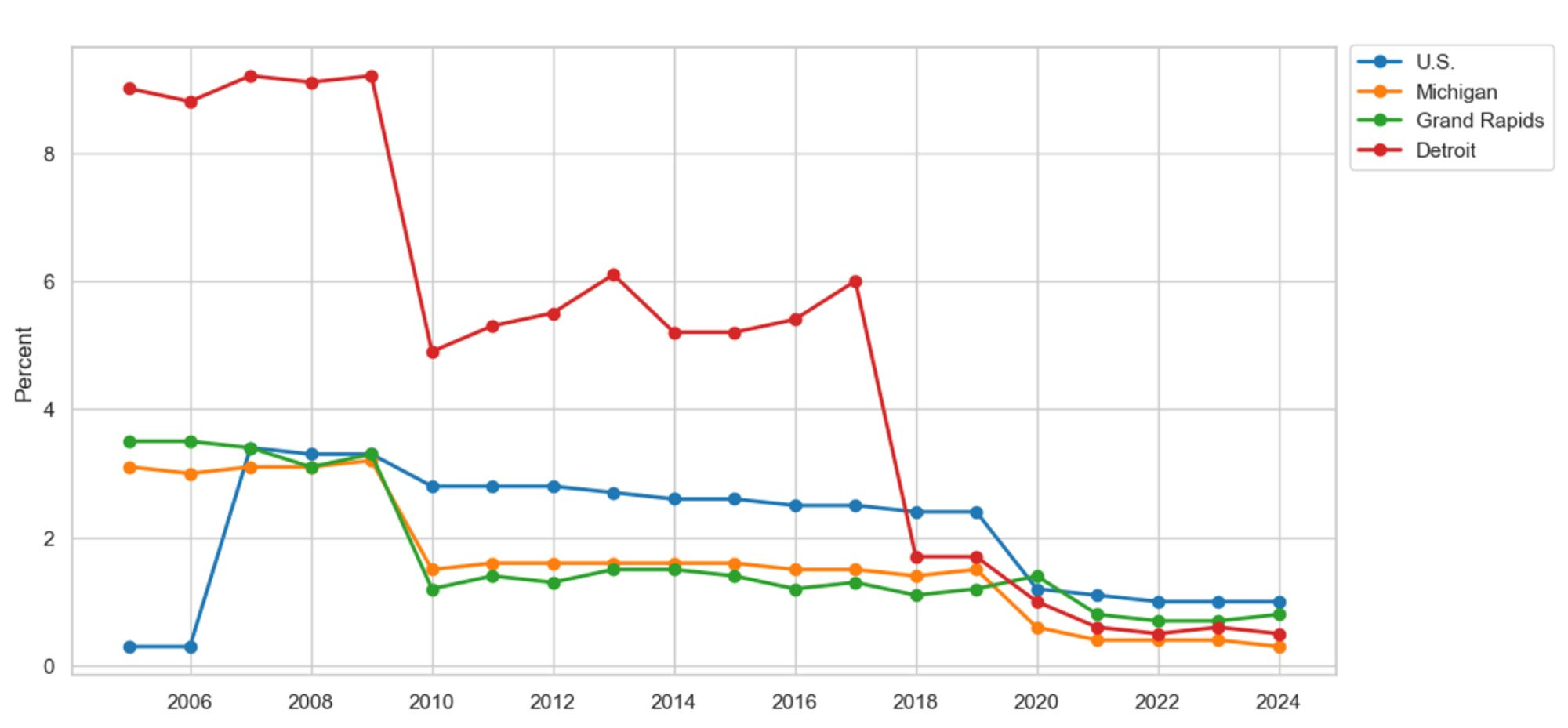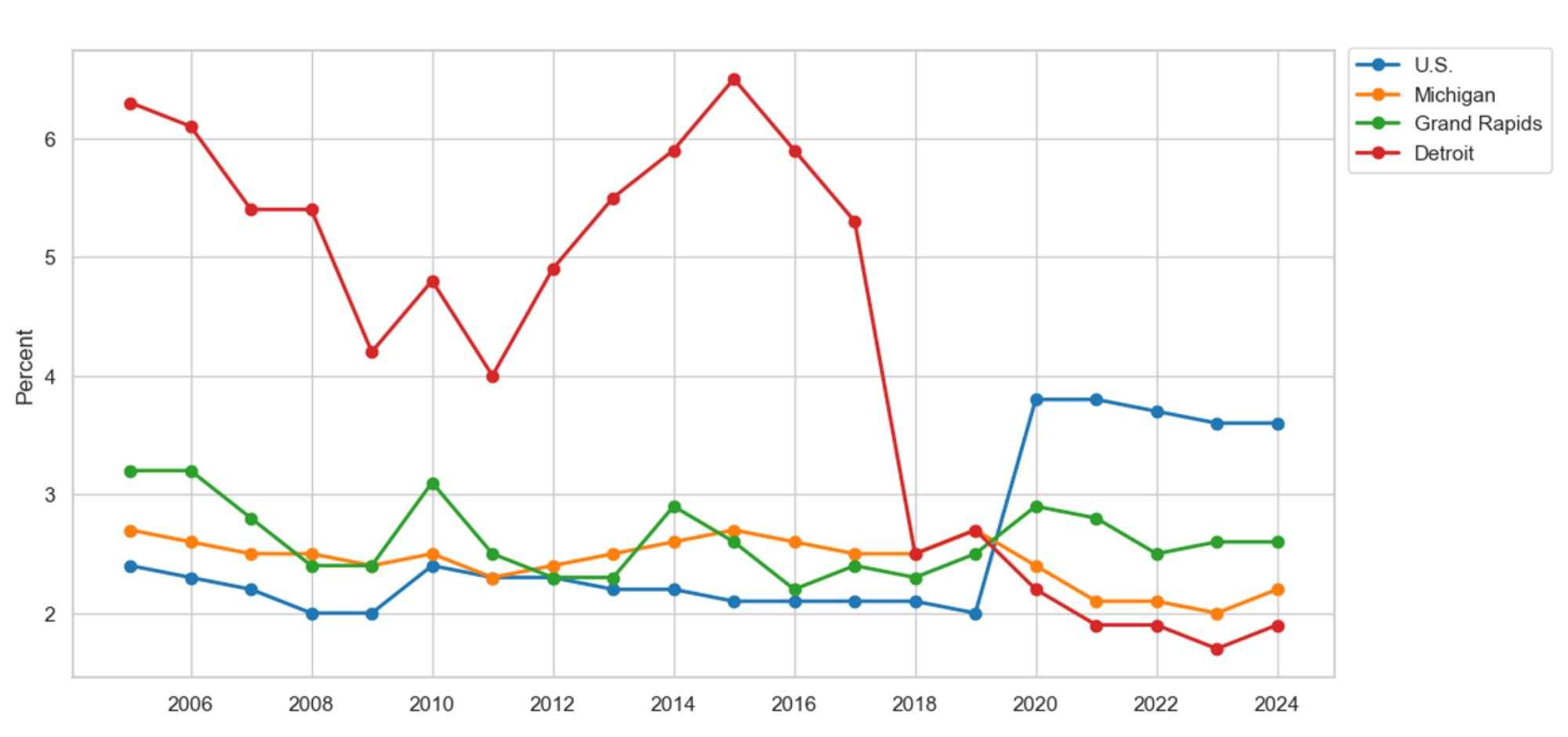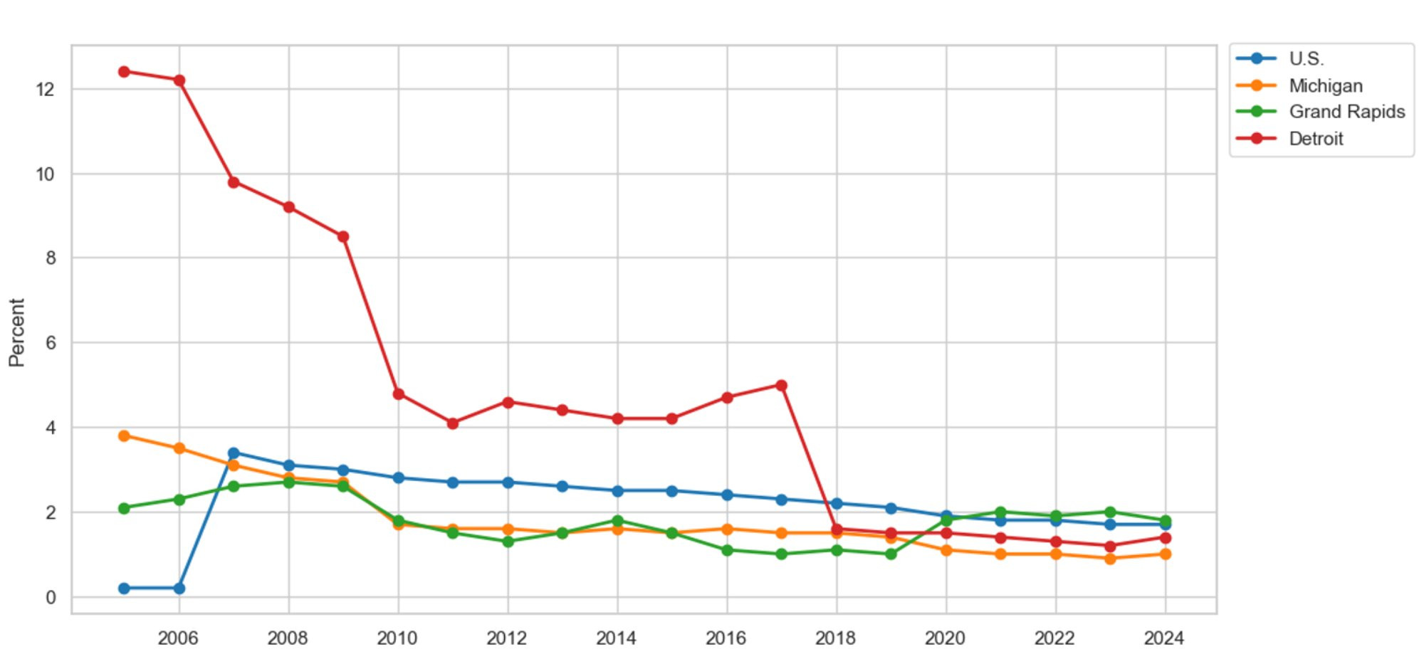 Figures 3 through 6 illustrate the evolution of industry employment since the onset of the Great Recession in the U.S., specifically in Michigan, including Grand Rapids and Detroit. Employment in each industry is taken as a percentage of total employment across all sectors to proxy the importance of that industry. All figures share a common trend: the relative importance of healthcare is increasing in all geographical samples. For example, healthcare practitioner and technical occupations, as well as healthcare support occupations, have collectively increased in Grand Rapids from 7.6 percent to 10.4 percent of total employment between 2005 and 2024. Healthcare is a vital component of West Michigan's economy, with 1 in 10 workers employed in the sector. Similar trends are found at the national and state levels. For example, healthcare as a percent of total employment has grown by 3.4 percent nationally, 2.7 percent at the state level, and by 3.4 percent in Detroit.