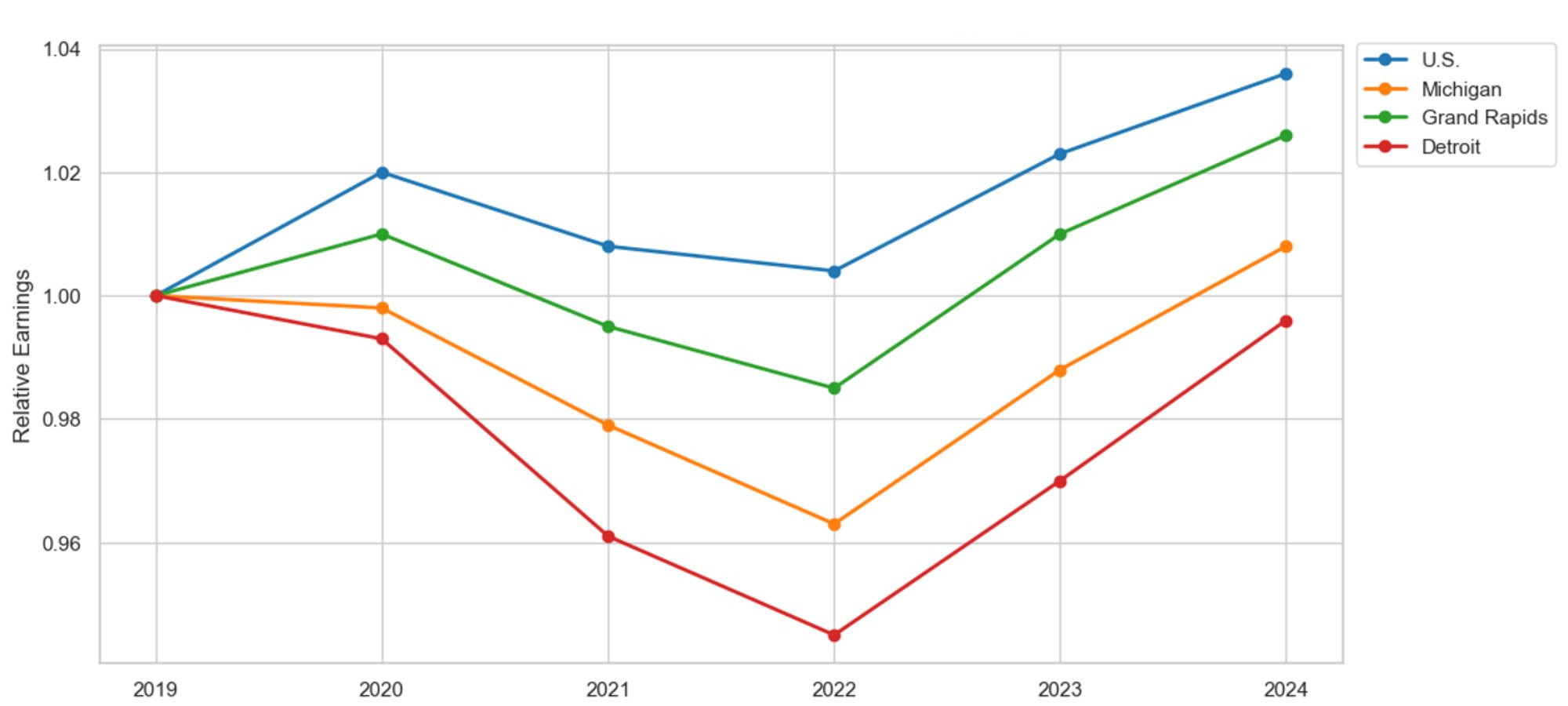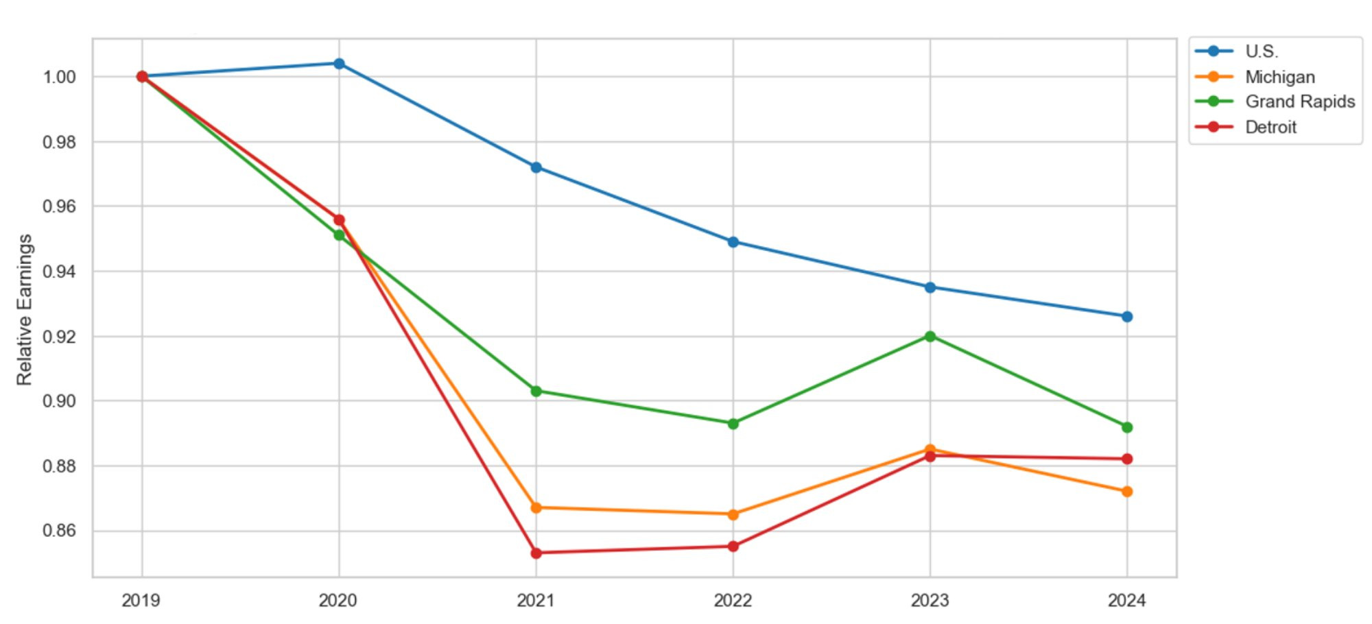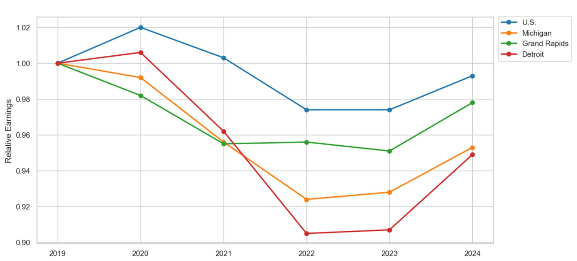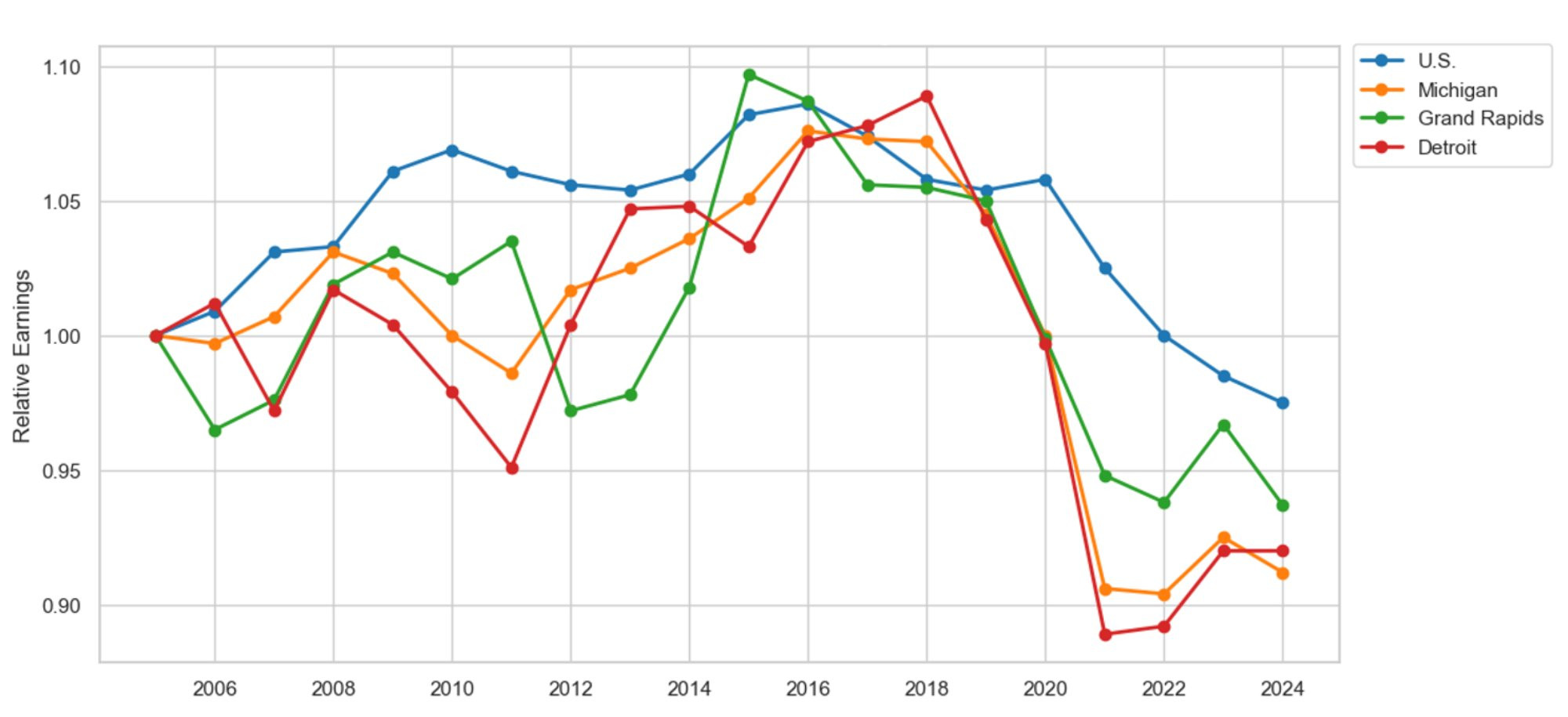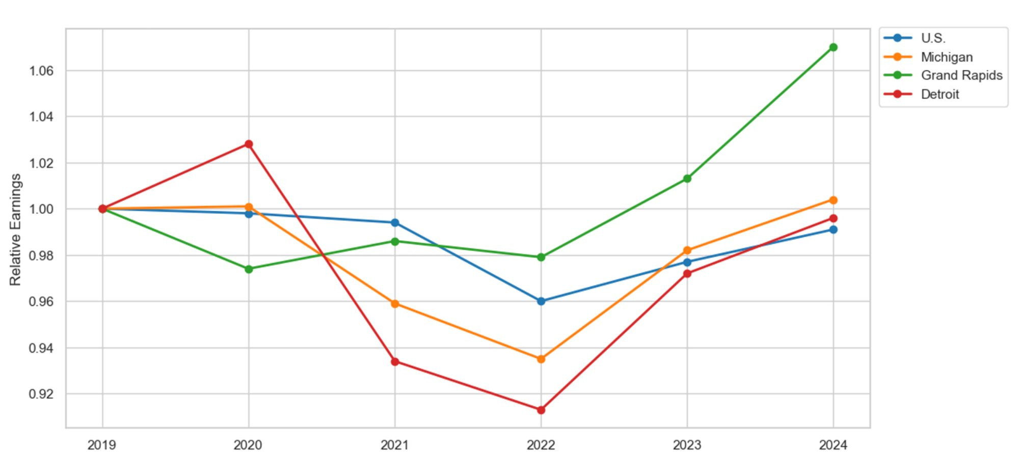 Description: Figure 22 illustrates relative inflation-adjusted earnings among medical assistants for the U.S., Michigan, Grand Rapids, and Detroit since the start of the COVID-19 pandemic in 2019. Inflation-adjusted earnings in Grand Rapids lagged the national average during the pandemic, indicating a below-average recovery in medical assistant earnings. However, inflation-adjusted earnings in Detroit initially exceeded the national average, only to fall below those in Grand Rapids. If the national average sets labor-market earnings expectations, then healthcare providers in Grand Rapids and Detroit would have found it hard to attract and retain medical assistants under their pay schemes.