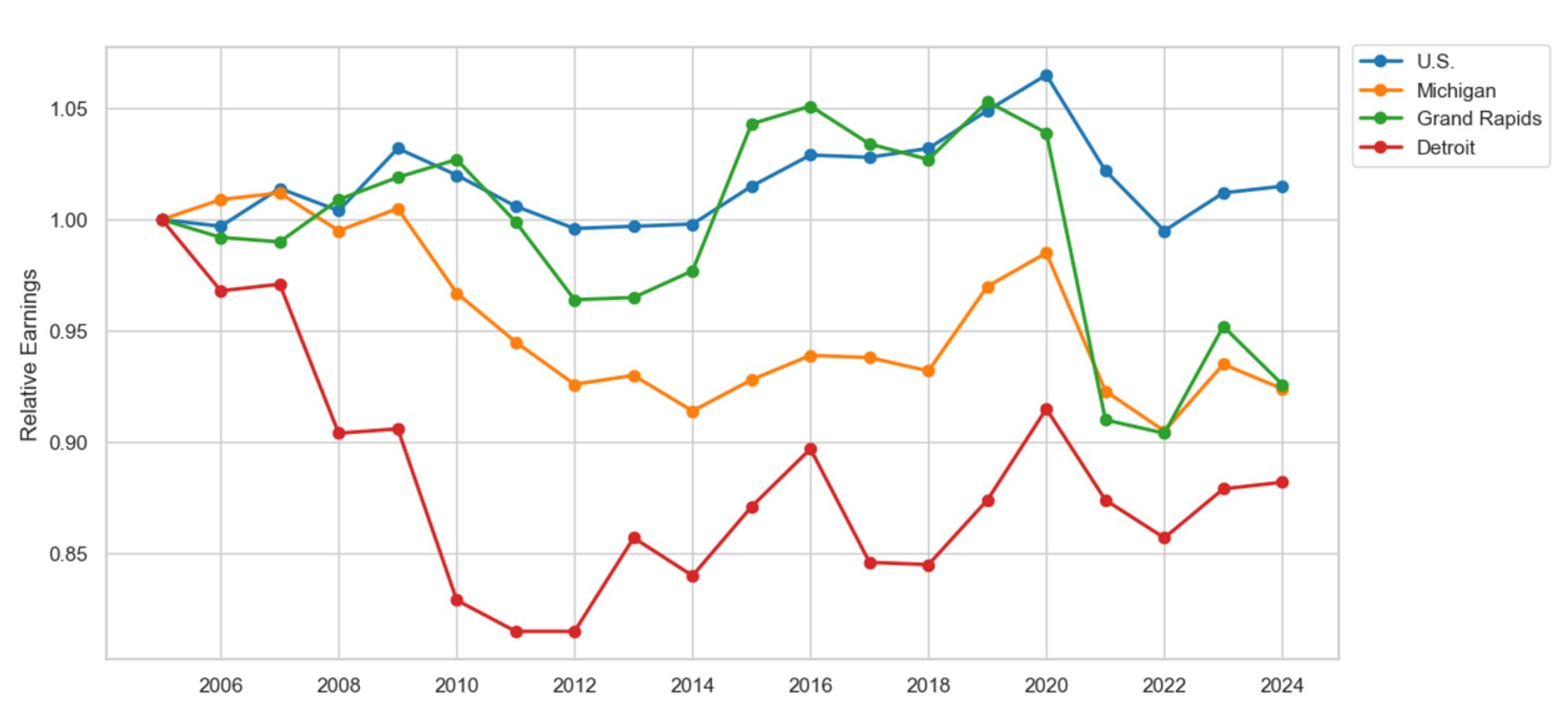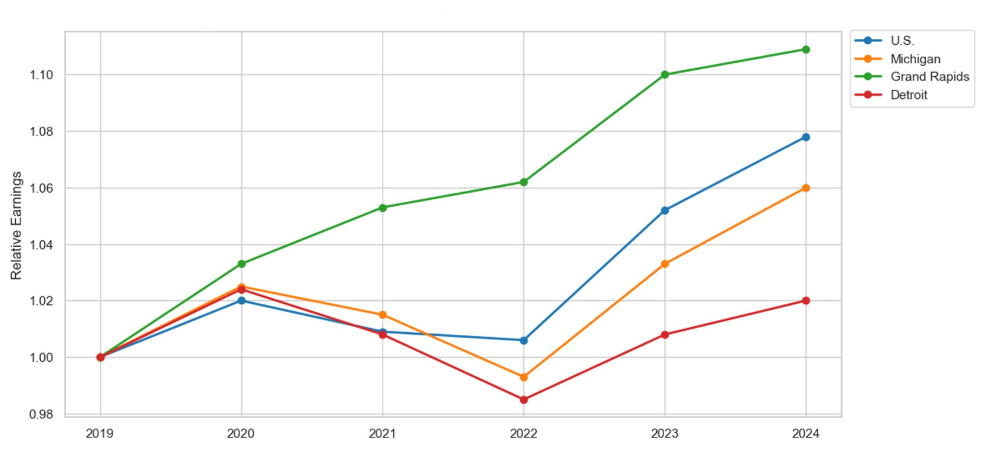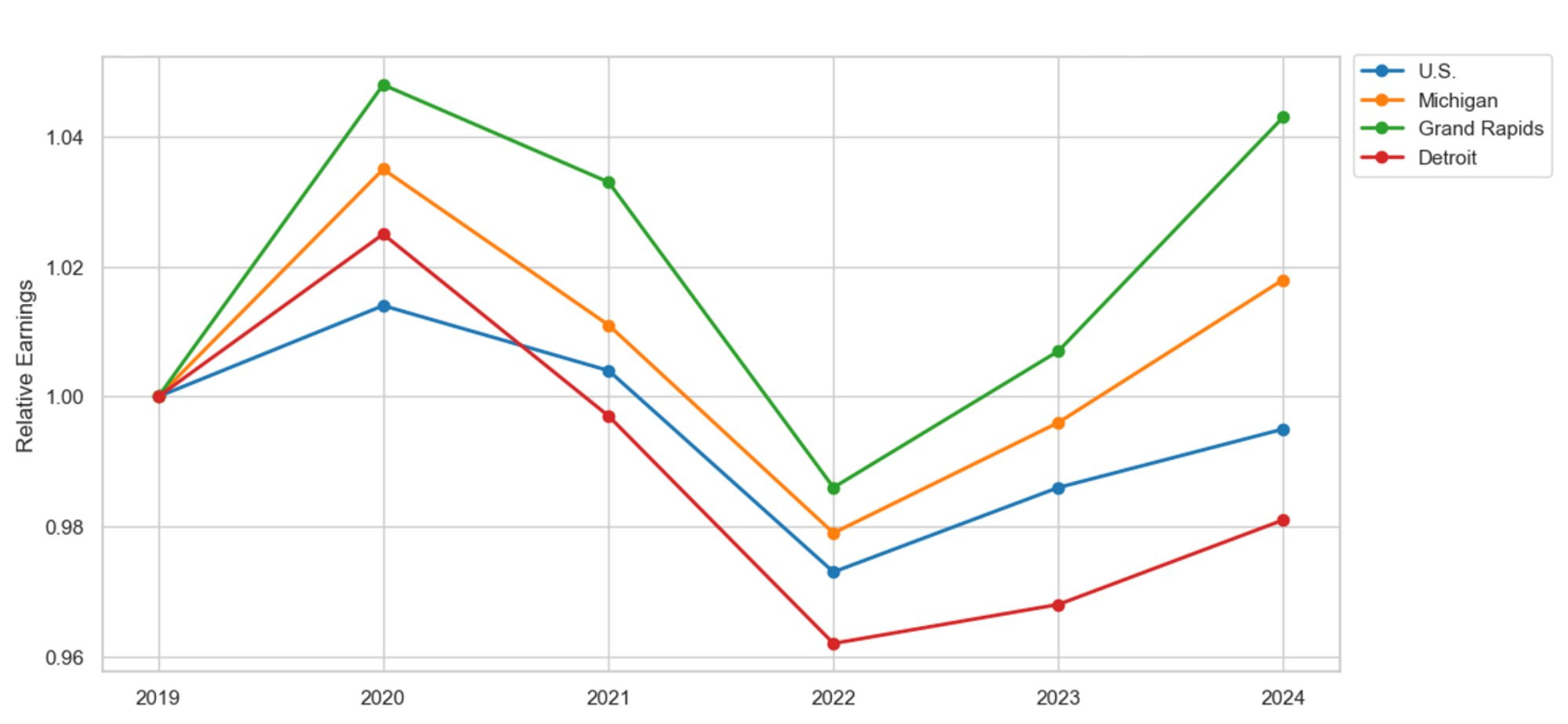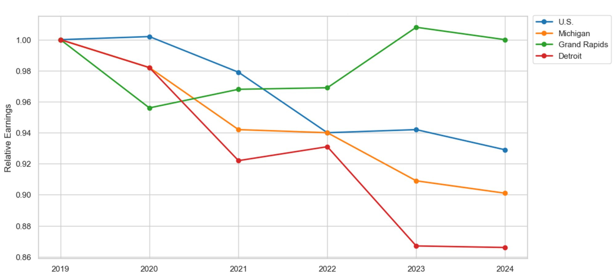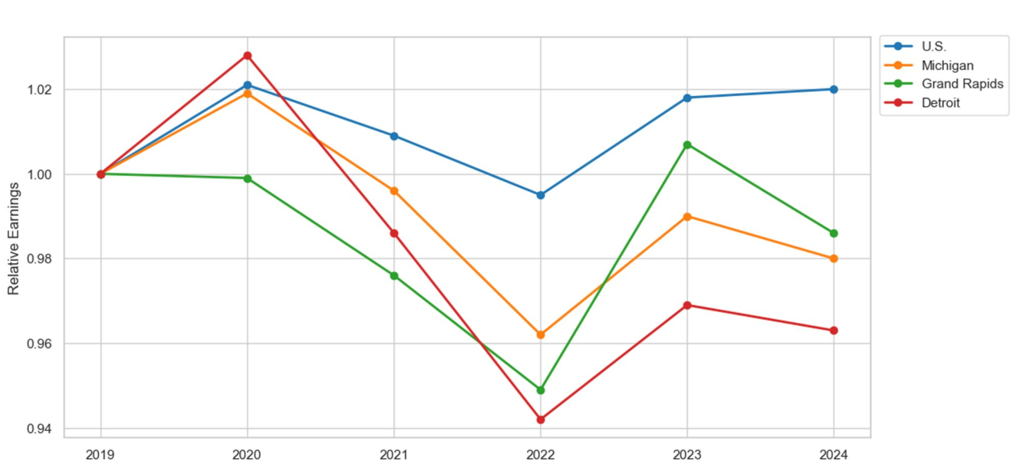 Description: Figure 22 illustrates relative inflation-adjusted earnings among medical assistants for the U.S., Michigan, Grand Rapids, and Detroit since the start of the COVID-19 pandemic in 2019. Inflation-adjusted earnings in Grand Rapids lagged the national average during the pandemic, indicating a below-average recovery in medical assistant earnings. However, inflation-adjusted earnings in Detroit initially exceeded the national average, only to fall below those in Grand Rapids. If the national average sets labor-market earnings expectations, then healthcare providers in Grand Rapids and Detroit would have found it hard to attract and retain medical assistants under their pay schemes.