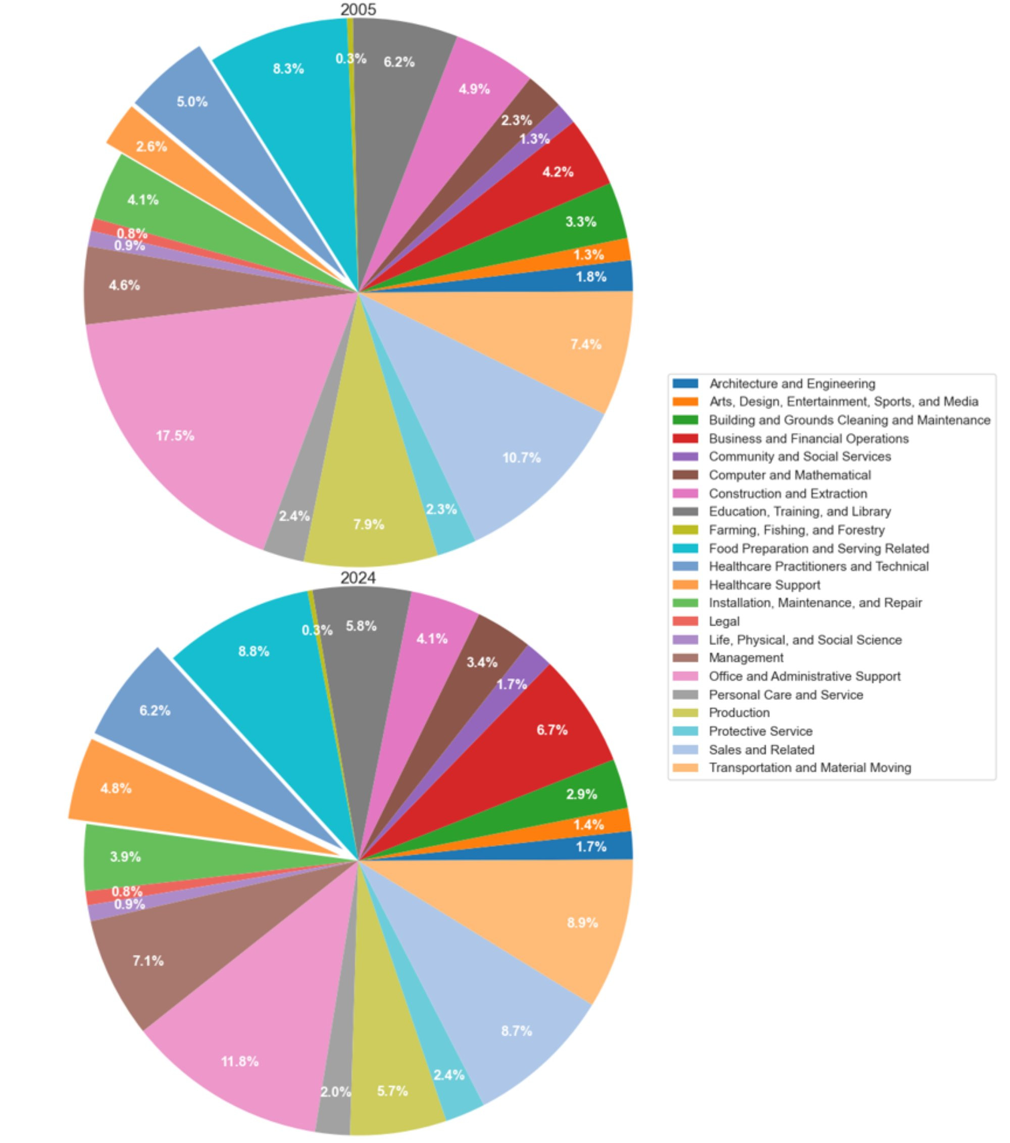 Description: Figure 5 shows the share of employment in each major industry in Grand Rapids from 2005 to 2024. Healthcare’s employment share has grown from 7.6 percent to 10.4 percent during this period. Employment in healthcare occupations has increased by 36.8 percent between 2005 and 2024. Currently, 1 in 10 workers in Grand Rapids works in healthcare occupations.