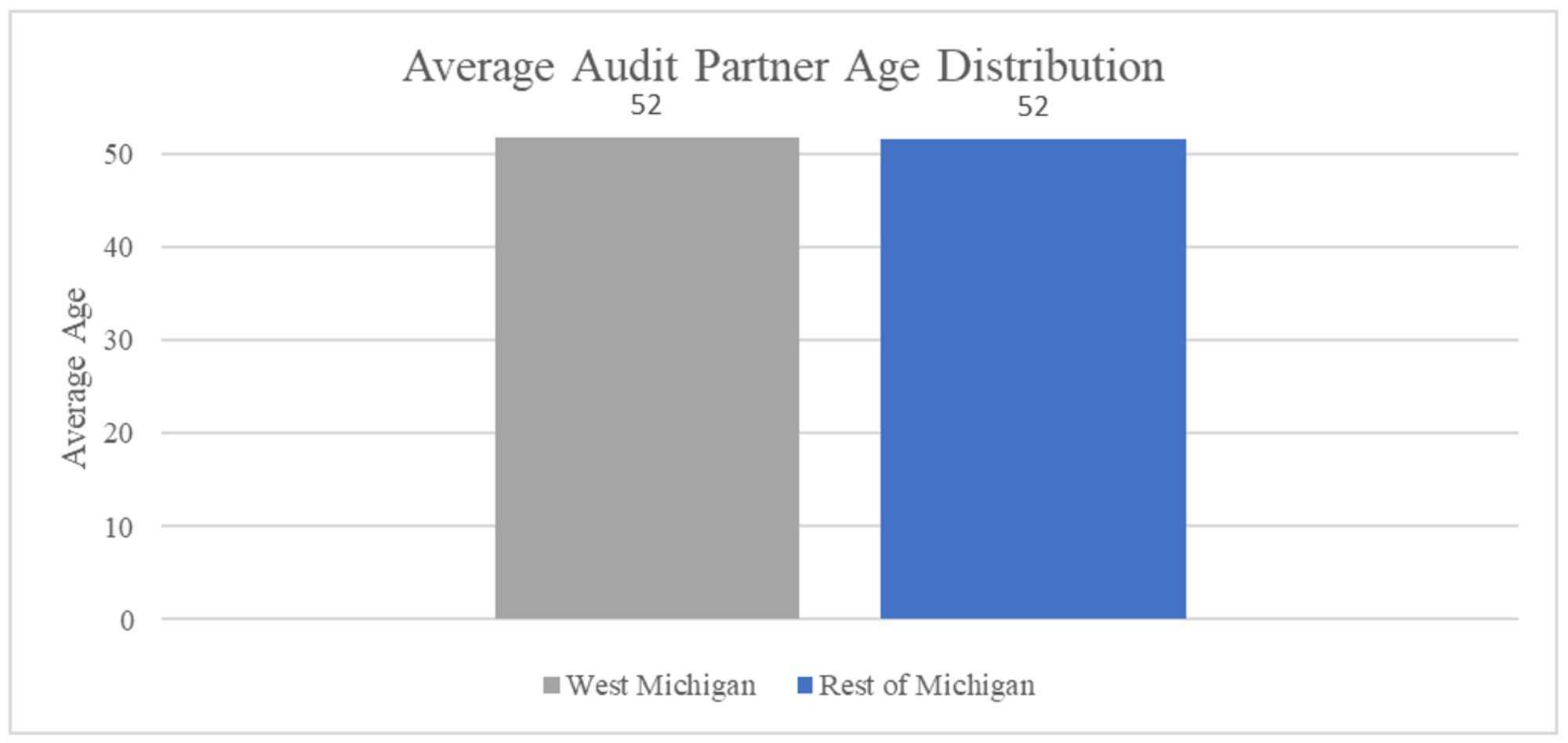 Figure 1 below highlights the average audit partner age in West Michigan compared to the rest of the state; both have an average audit partner age of 52.