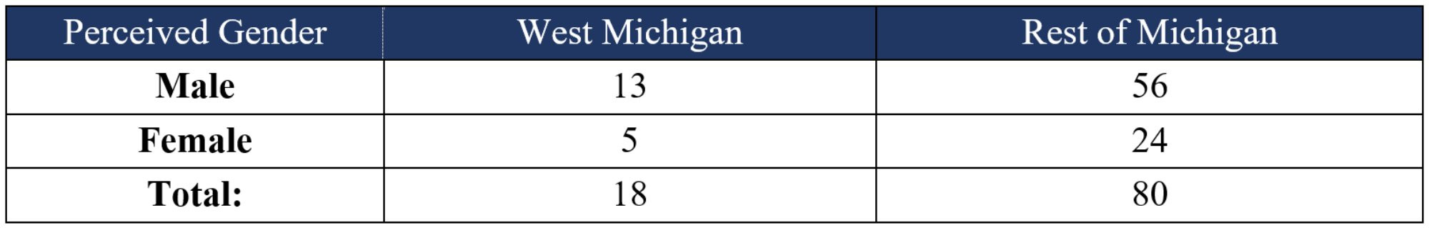 Table 2 below shows the breakdown of perceived gender composition of audit partners across Michigan, separating West Michigan from the rest of the state.