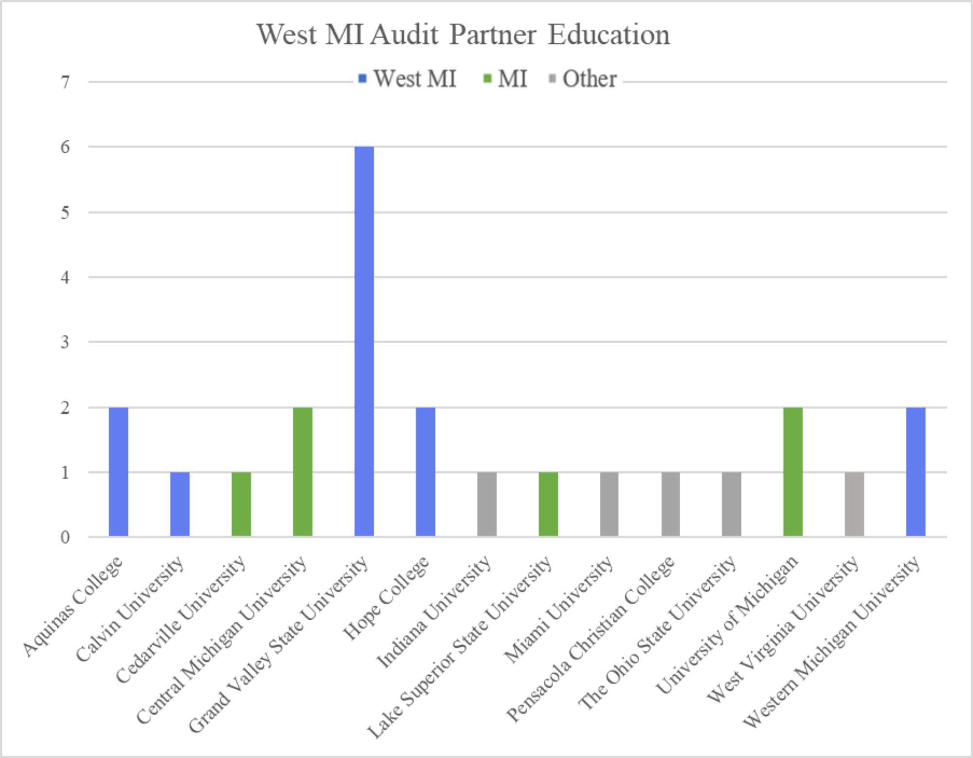 Most West Michigan audit partners’ degrees are from Grand Valley State University. This demonstrates the university’s influence in West Michigan and its proximity to the city of Grand Rapids where large audit firms have offices, indicating strong connections between local universities and employers.