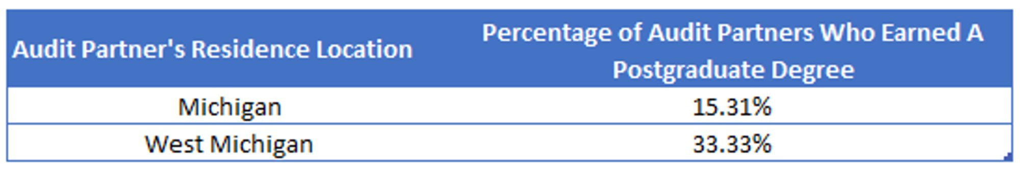 The data we collected in Table 1 illustrates that a higher percentage of audit partners in West Michigan have earned a secondary degree compared to those in Michigan as a whole. This could indicate a higher level of investment in education in West Michigan, especially for those who were targeting accounting/auditing jobs in the local area.